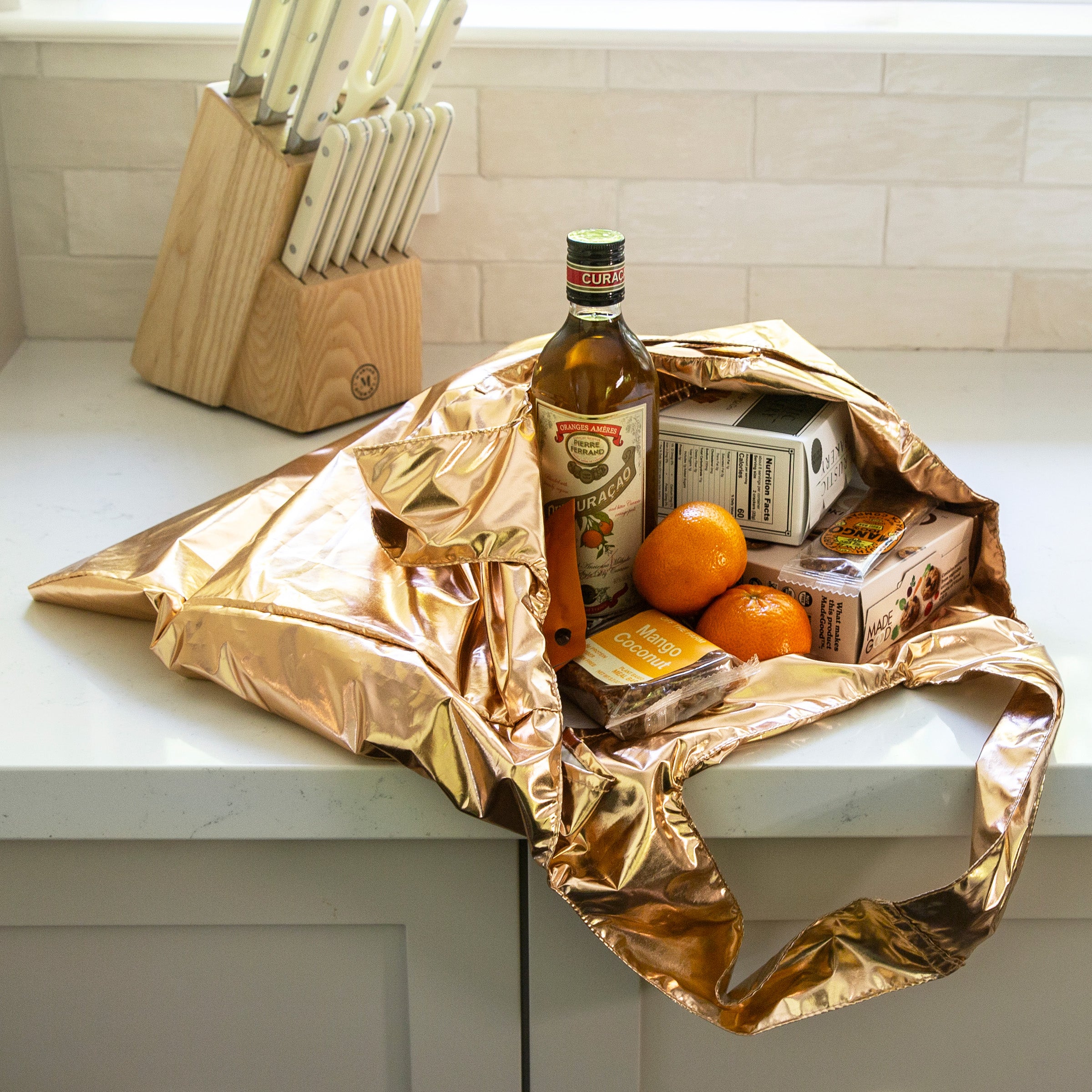 Shiny, sturdy, and smart — the Youzey Metallic Reusable Tote Bag is your go-to for errands, groceries, and everyday adventures. Designed with a bold metallic finish, each tote folds neatly into its own matching pouch, making it easy to stash in your purse, car, or backpack. Durable enough for weekly grocery runs yet chic enough for travel or daily carry, it’s a stylish alternative to single-use plastic bags. Available in three striking metallic colors: red, blue, and gold.