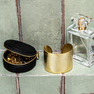 This wide gold cuff bracelet makes a statement without saying a word. Crafted in a rich, warm gold tone, its brushed, textured finish creates a beautifully organic, hand-swept look that catches the light from every angle. The open cuff design allows for easy wear and a slightly adjustable fit, while the smooth interior keeps it comfortable against the skin.