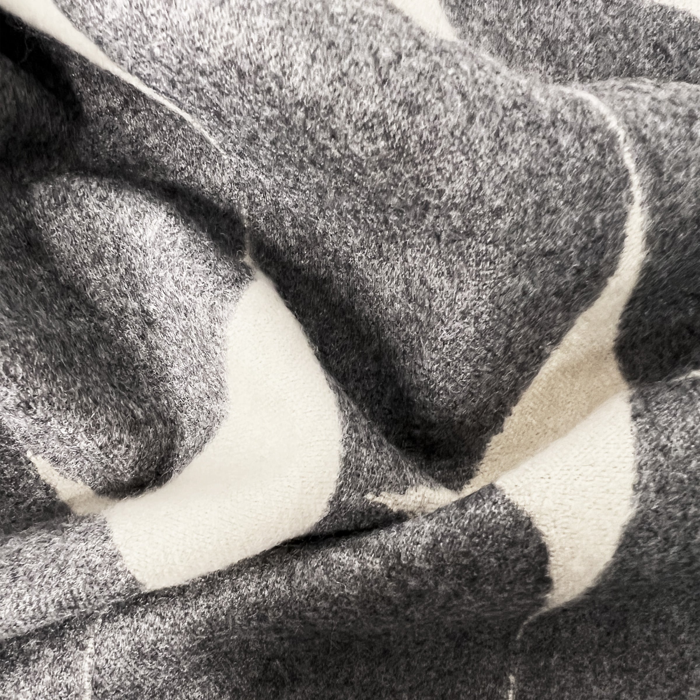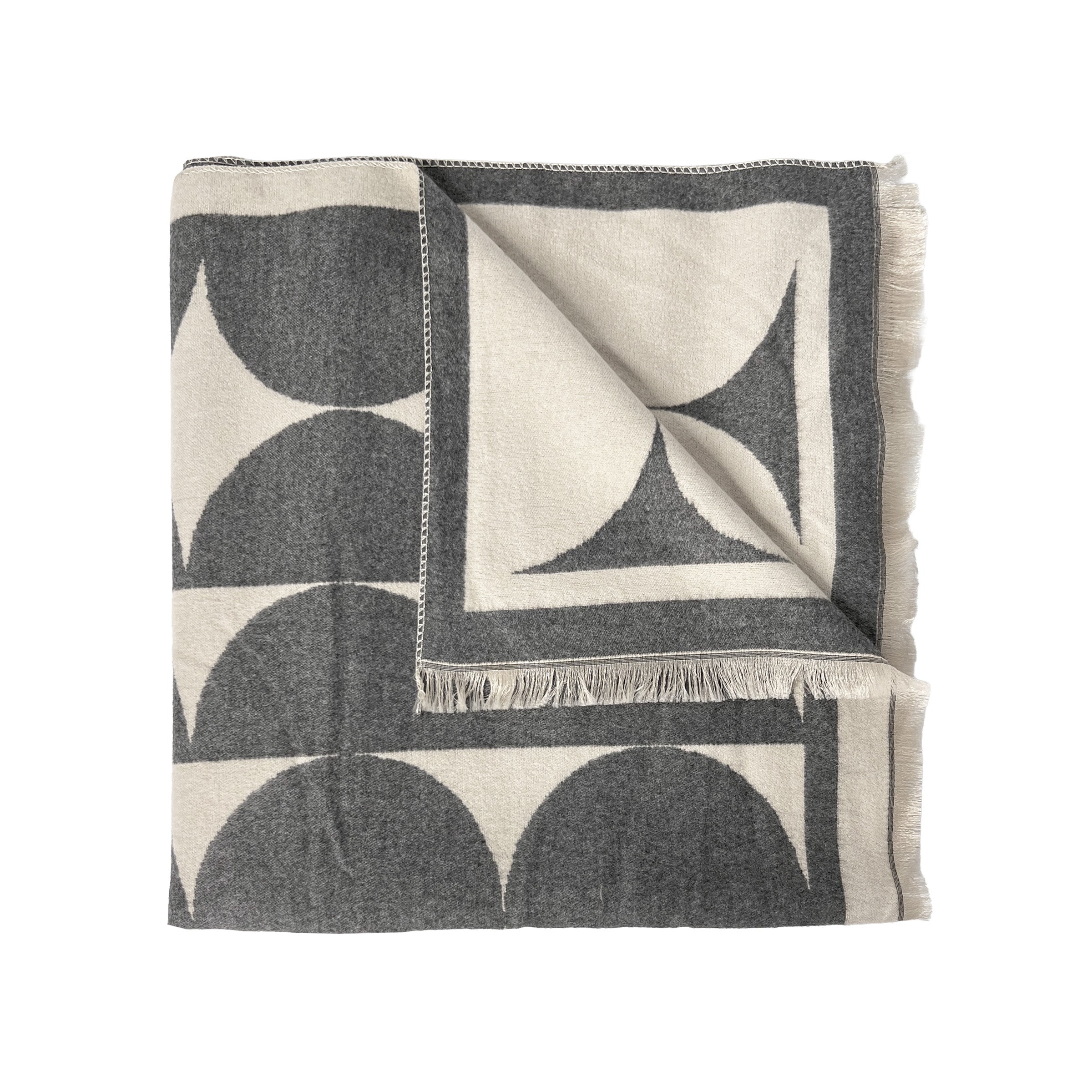 The Amber scarf makes a bold impact with its mod-inspired circular design in charcoal and cream. Clean lines and graphic repetition give it a retro-cool vibe that feels fresh, fun, and fashion-forward.