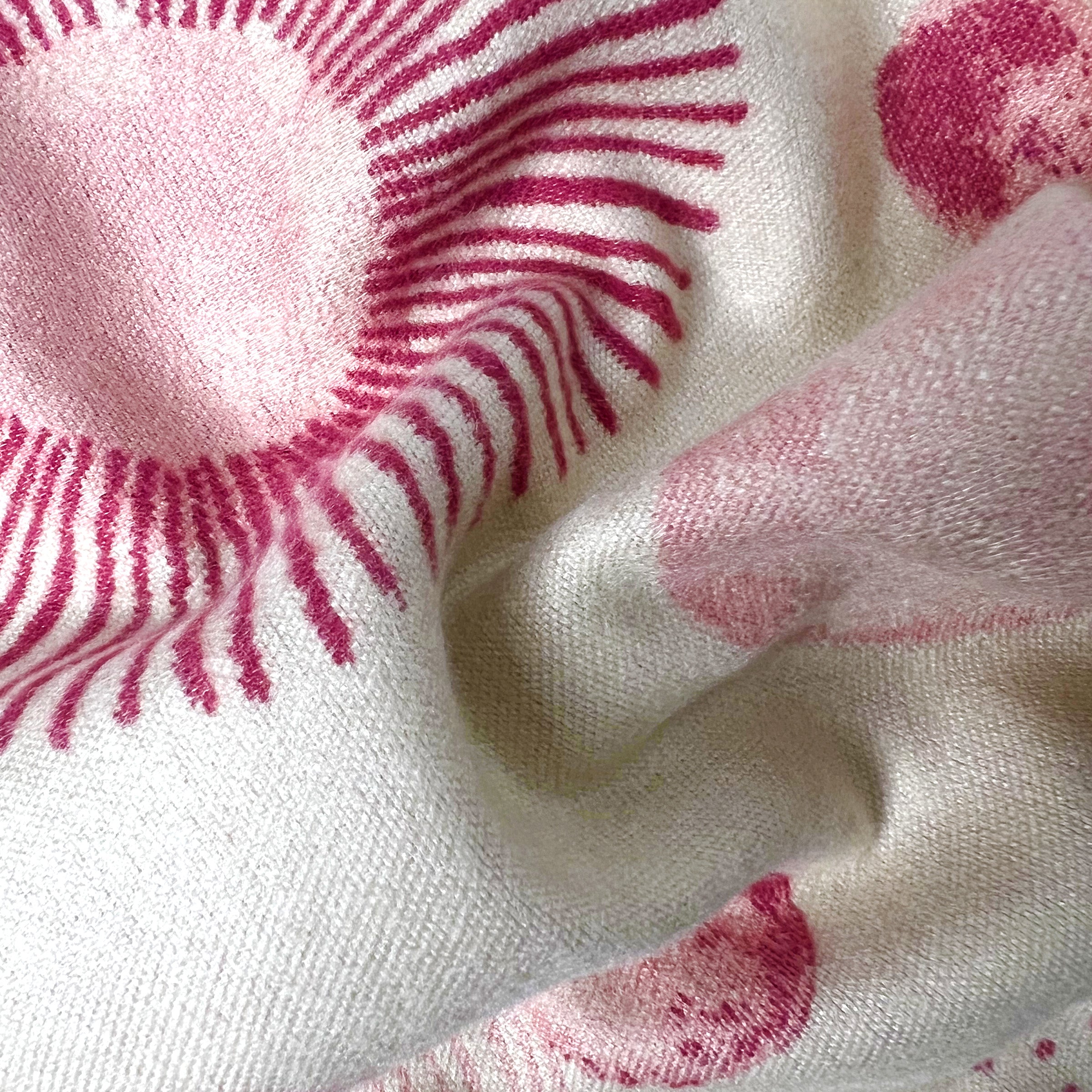 Playful yet refined, The Margaret scarf features a scatter of pink-toned circular motifs that feel both artistic and joyful. The mix of dotted, textured designs adds depth and personality to this soft statement piece.