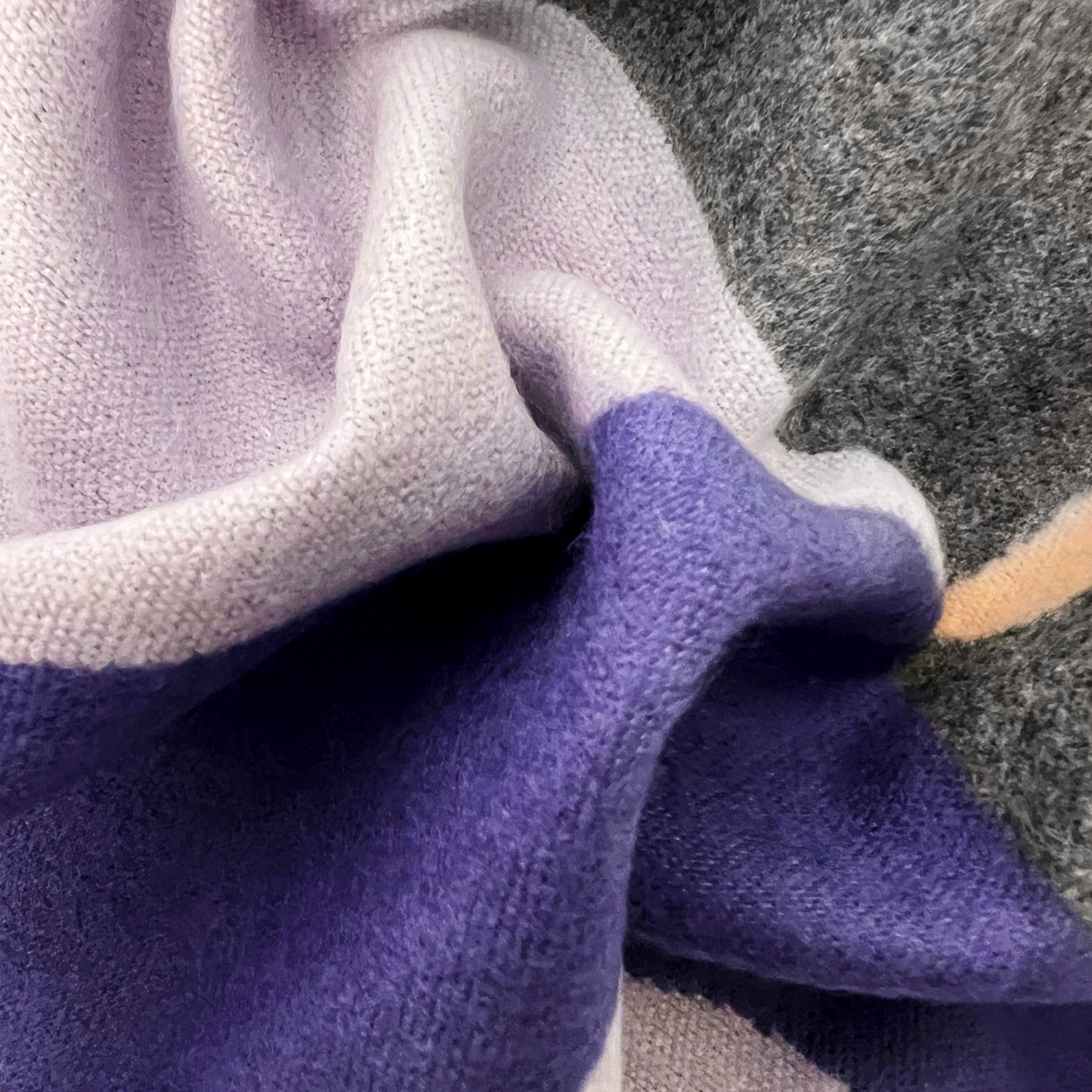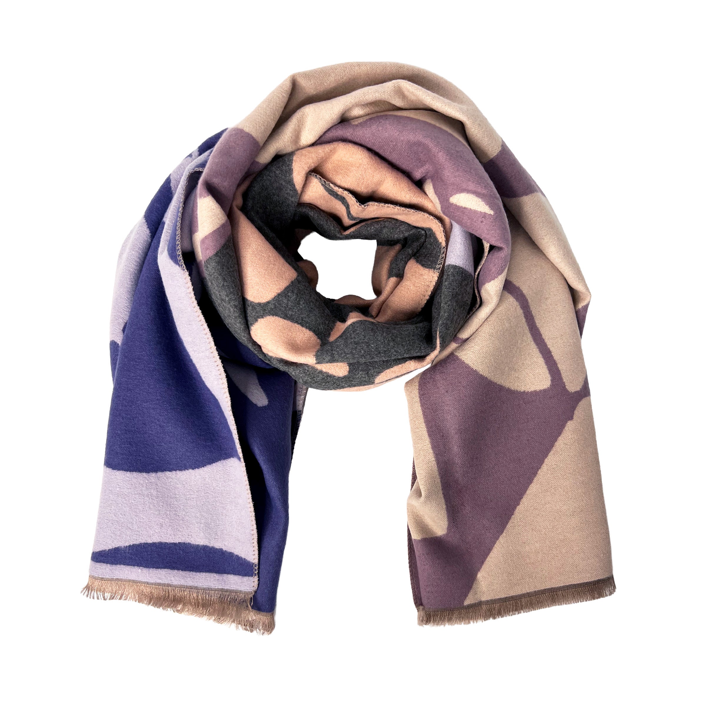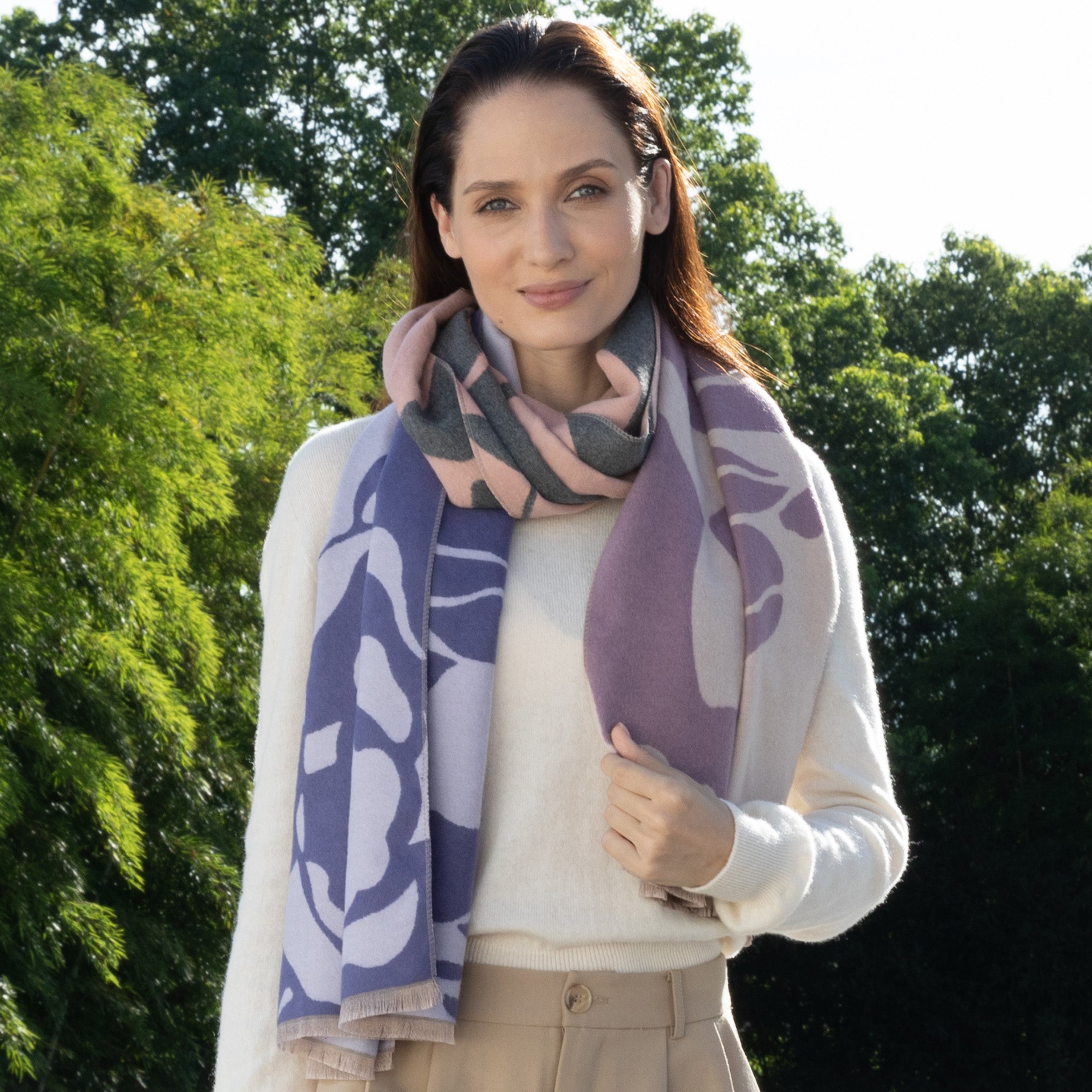 Soft curves and dreamy hues bring feminine elegance to The Stella. With a large-scale abstract floral pattern in shades of purple, mauve, and blush, this scarf is a wearable work of art that adds color and style to any outfit.