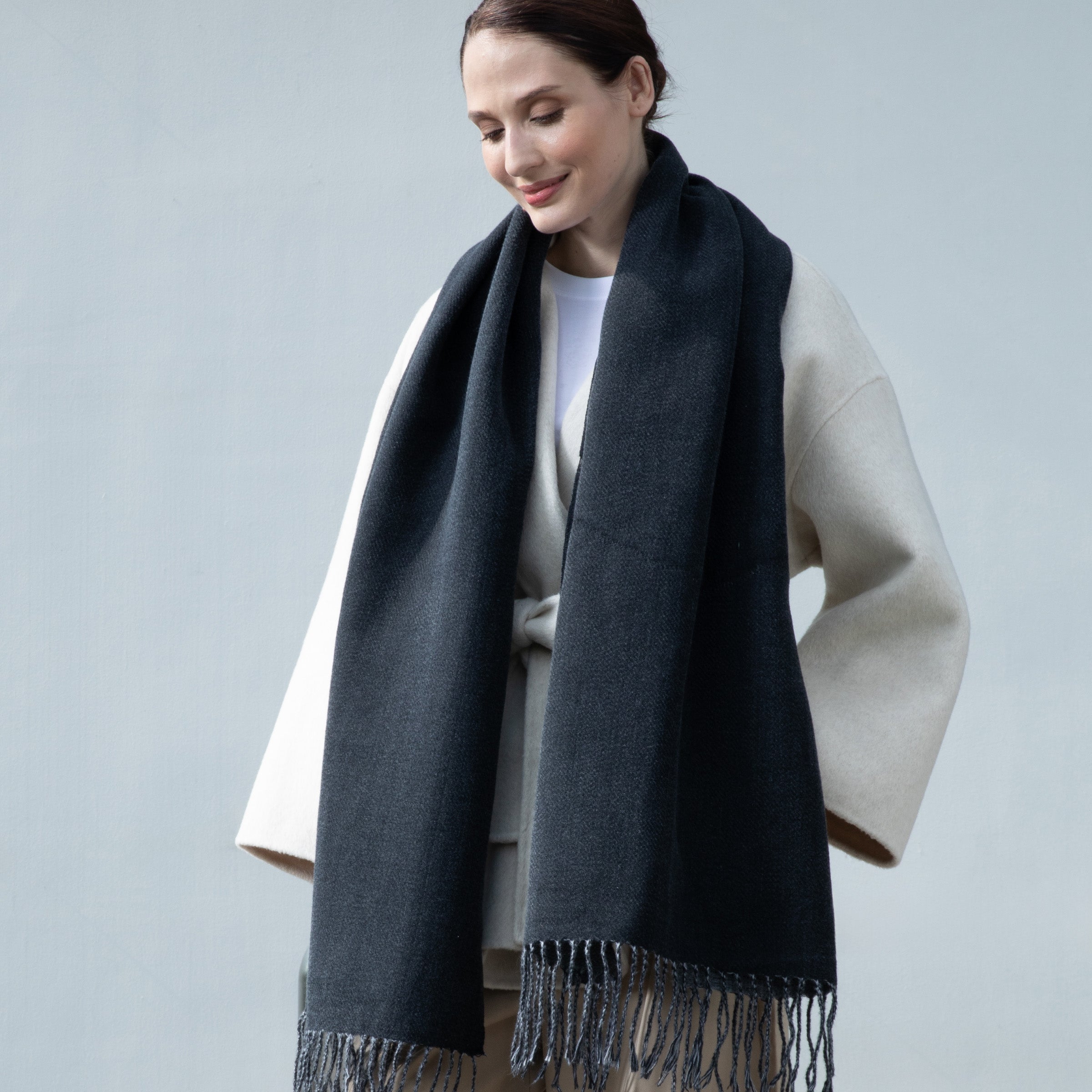 Wrap yourself in timeless elegance with our reversible pashmina scarf, the must-have accessory for luxury lovers and fashion-forward individuals looking to elevate their style. Crafted from a soft viscose and polyester blend, this scarf offers the plush feel of cashmere, ensuring warmth and comfort without sacrificing style. Whether you're strolling through the city streets or attending an evening soiree, the ultrasoft texture of this scarf will keep you warm and cozy.
