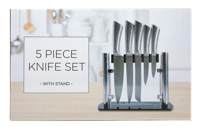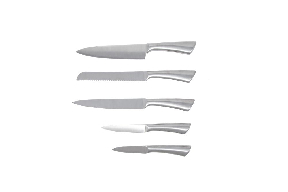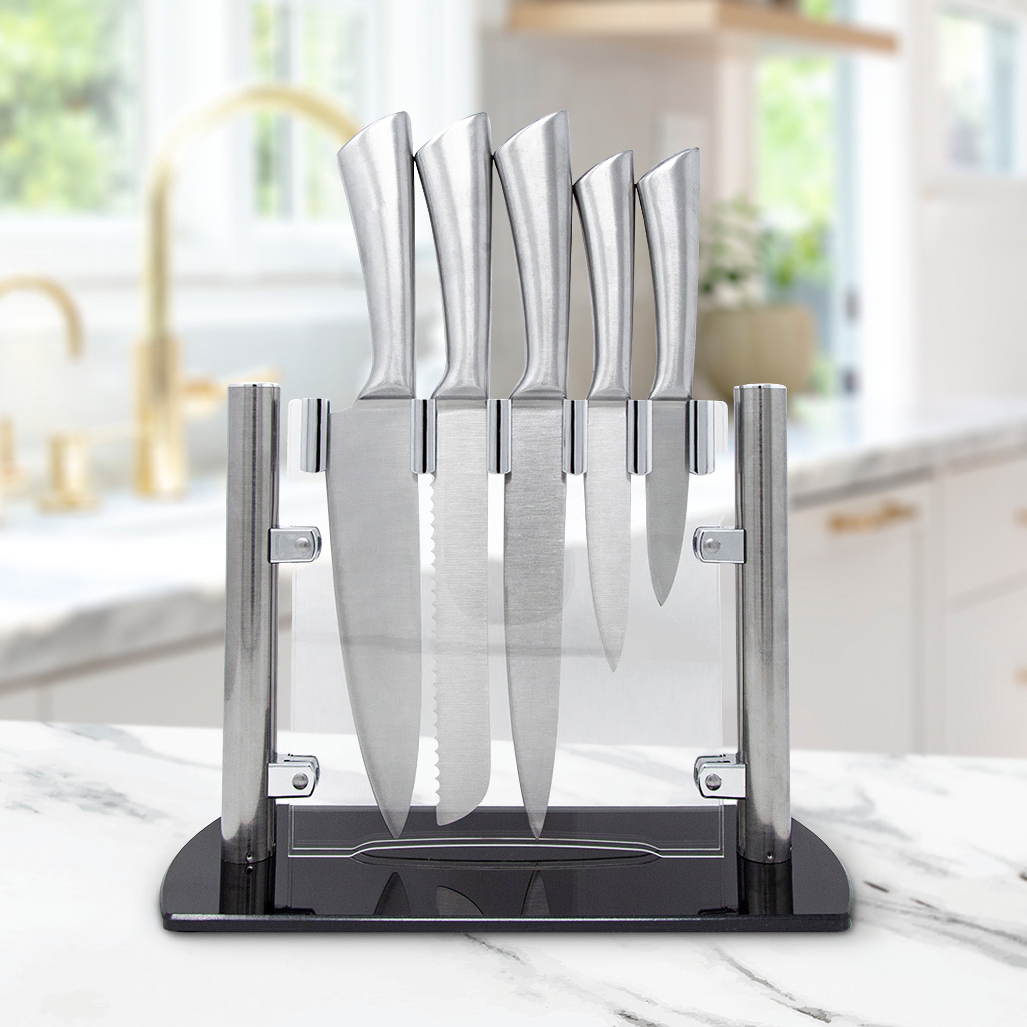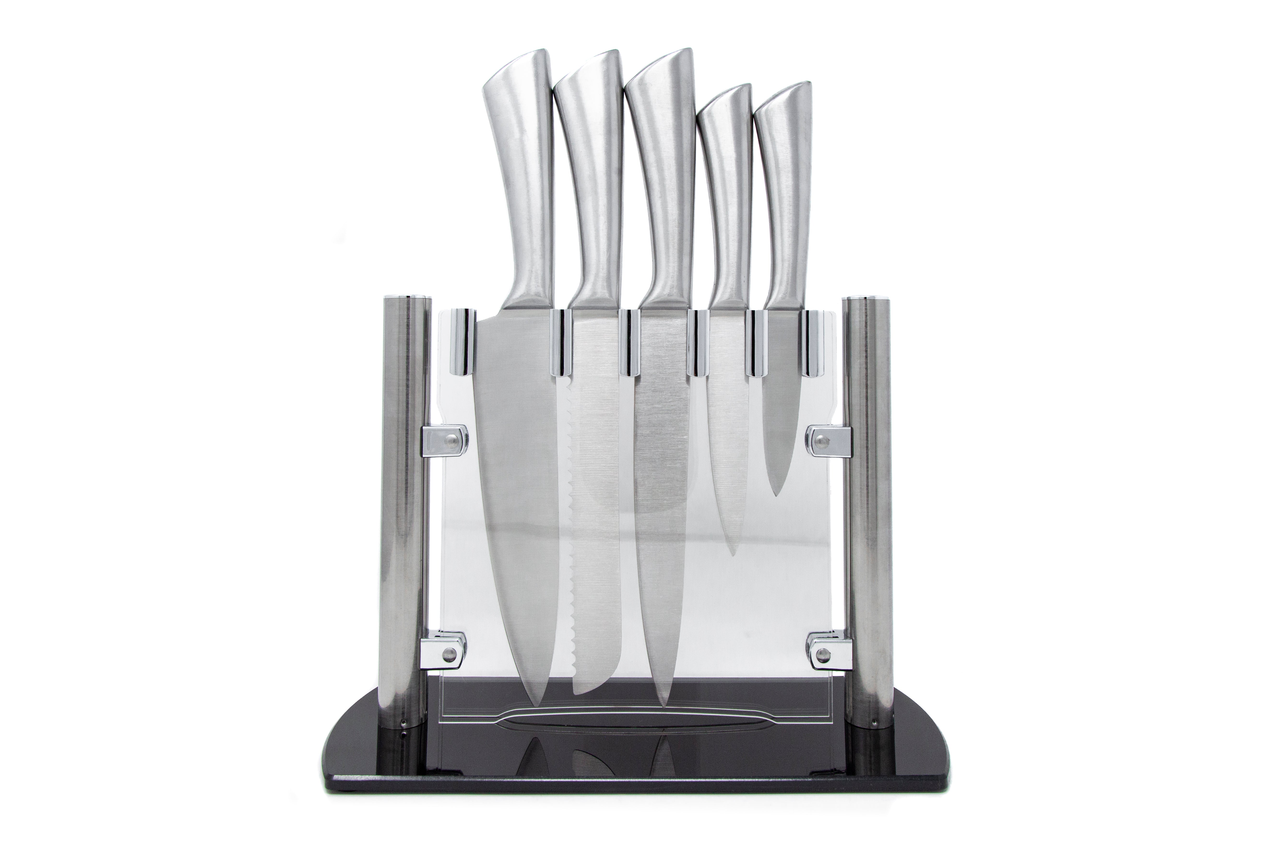 Precision cutlery by YOUZEY. This collection of high grade, stainless-steel blades are made to retain a razor-sharp edge and have rounded handles for an easy grip. Ideal for home cooks who need a comprehensive range of cutlery for their daily use. Complete with stand for easy access. Looks great displayed in your kitchen.