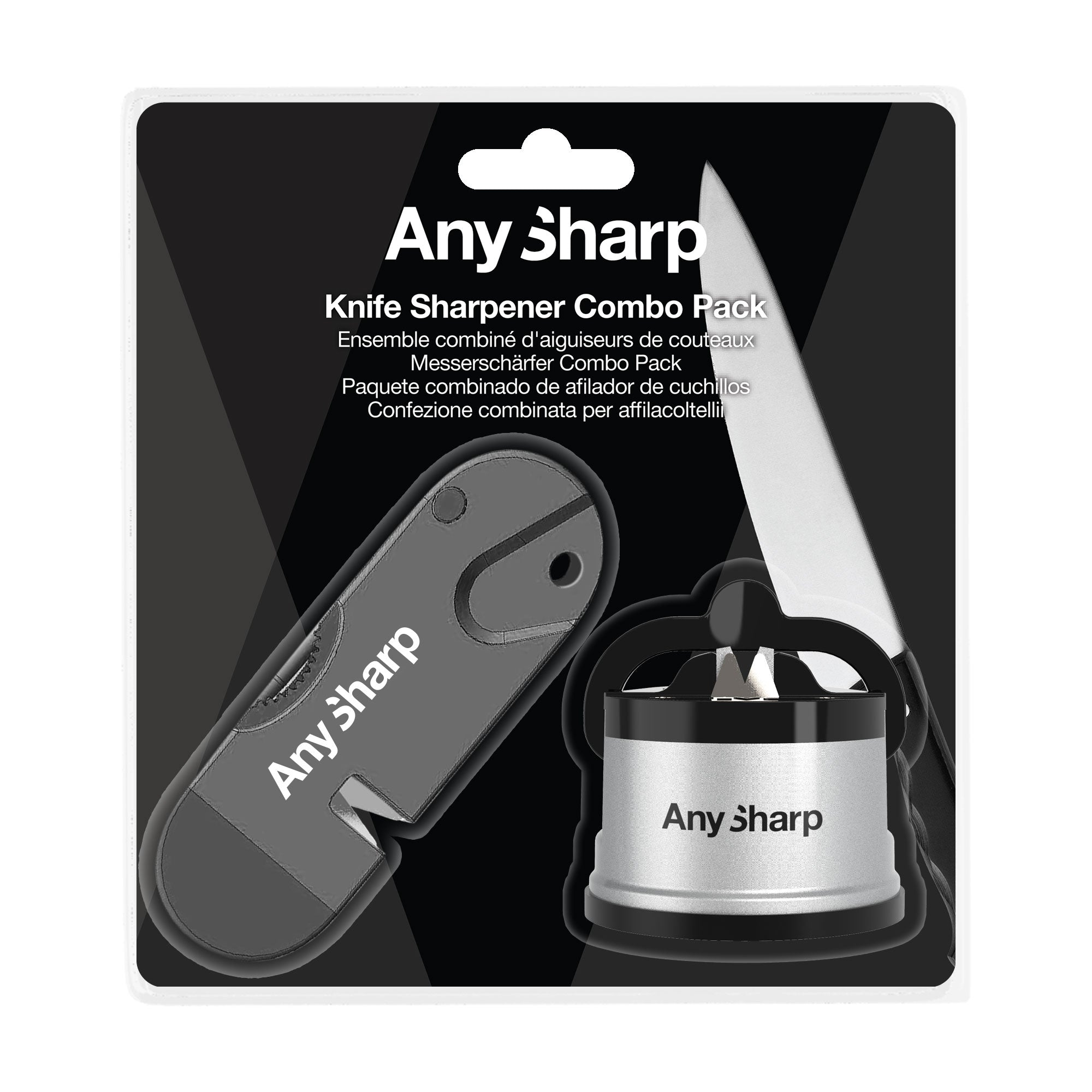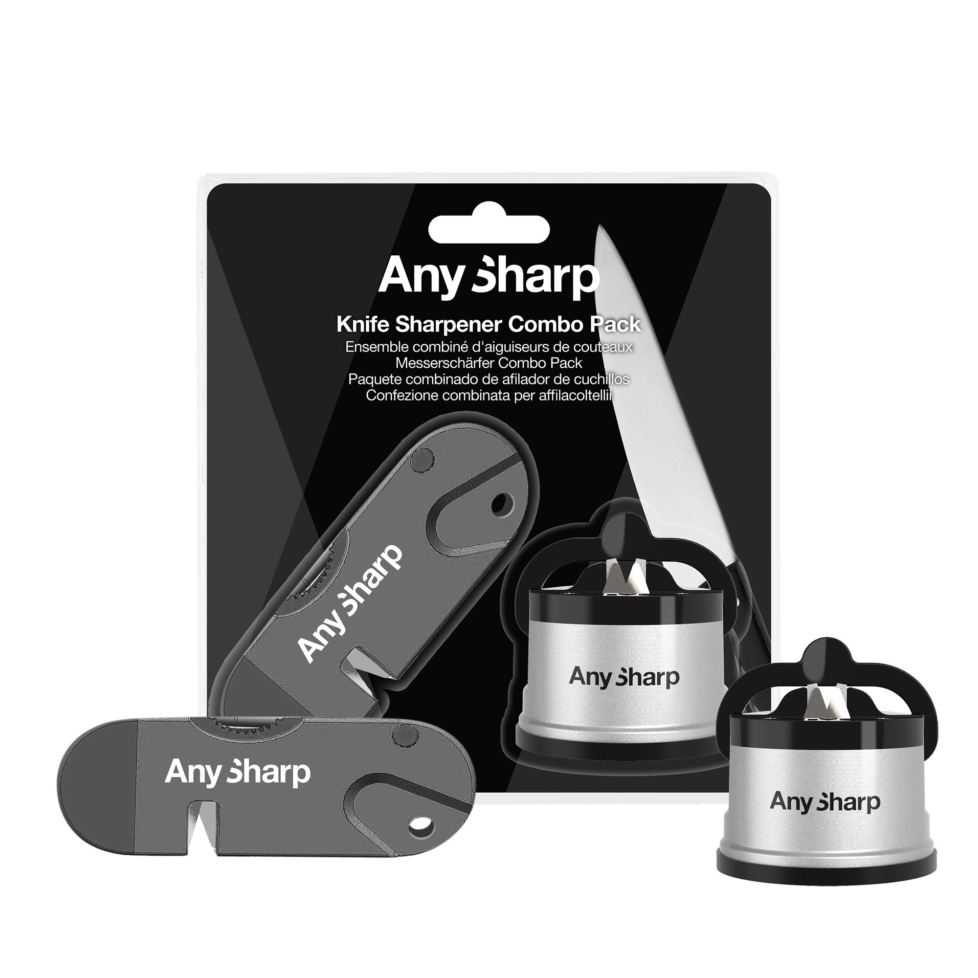 AnySharp knife Sharpeners rejuvenate knives safely and hands-free. A few light strokes, and in seconds, the knife is sharp as new. The patented Power Grip suction cup base keeps the sharpener in place and the advanced diamond-honed Tungsten Carbide blades easily sharpen almost any knife. Professional-grade knife sharpening that helps make cooking easy and safe!