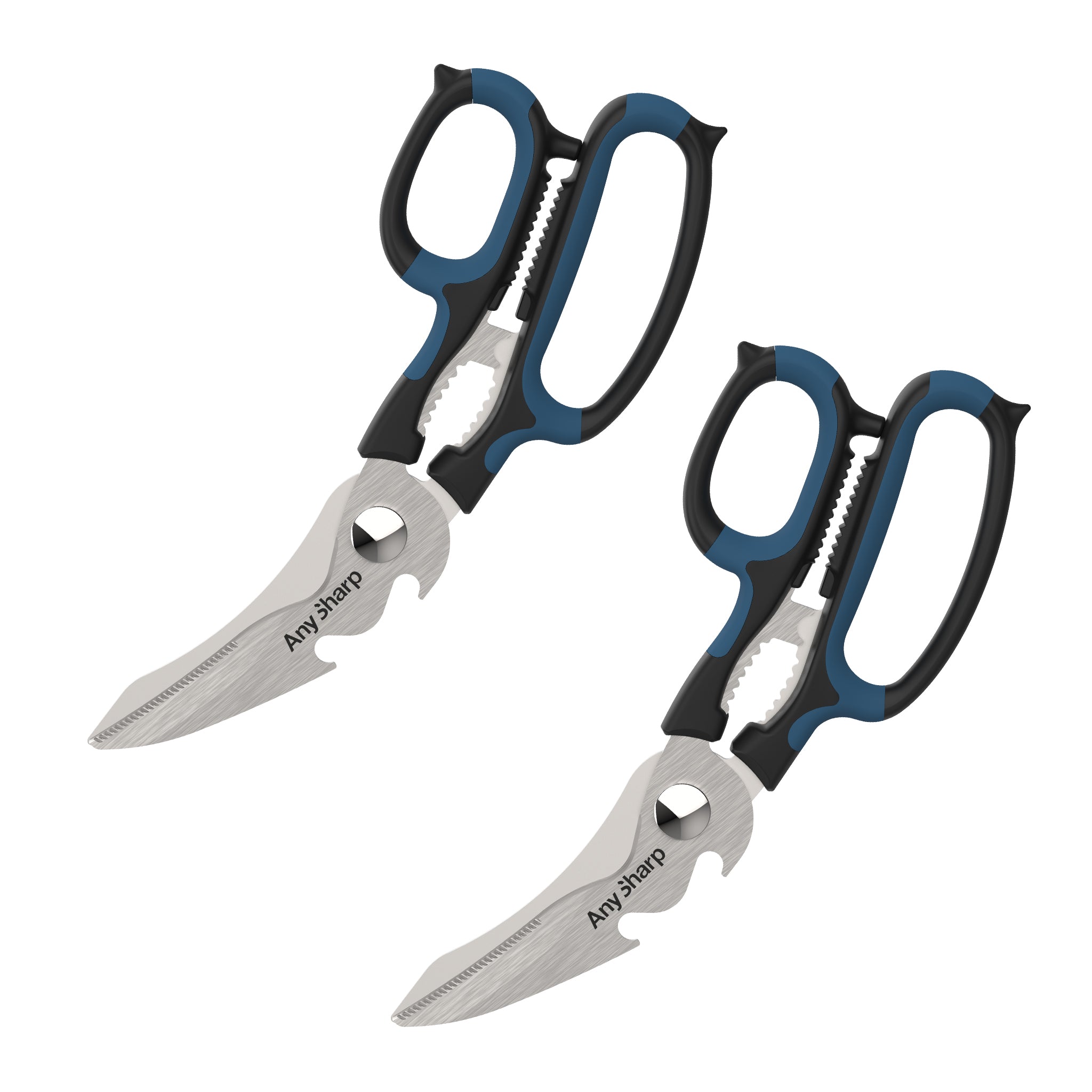 The AnySharp 5-in-1 Multifunction Scissors may be the only scissors you will ever need! Five handy tools all rolled into one: 1) “Cut-anything” scissors; 2) Bottle opener; 3) Garlic crusher; 4) Nut cracker; and 5) Wire stripper. These razor-sharp, hardened steel blades easily cut tough materials, such as blister packs, wire, cloth, carpet, meat, and even chicken bone!