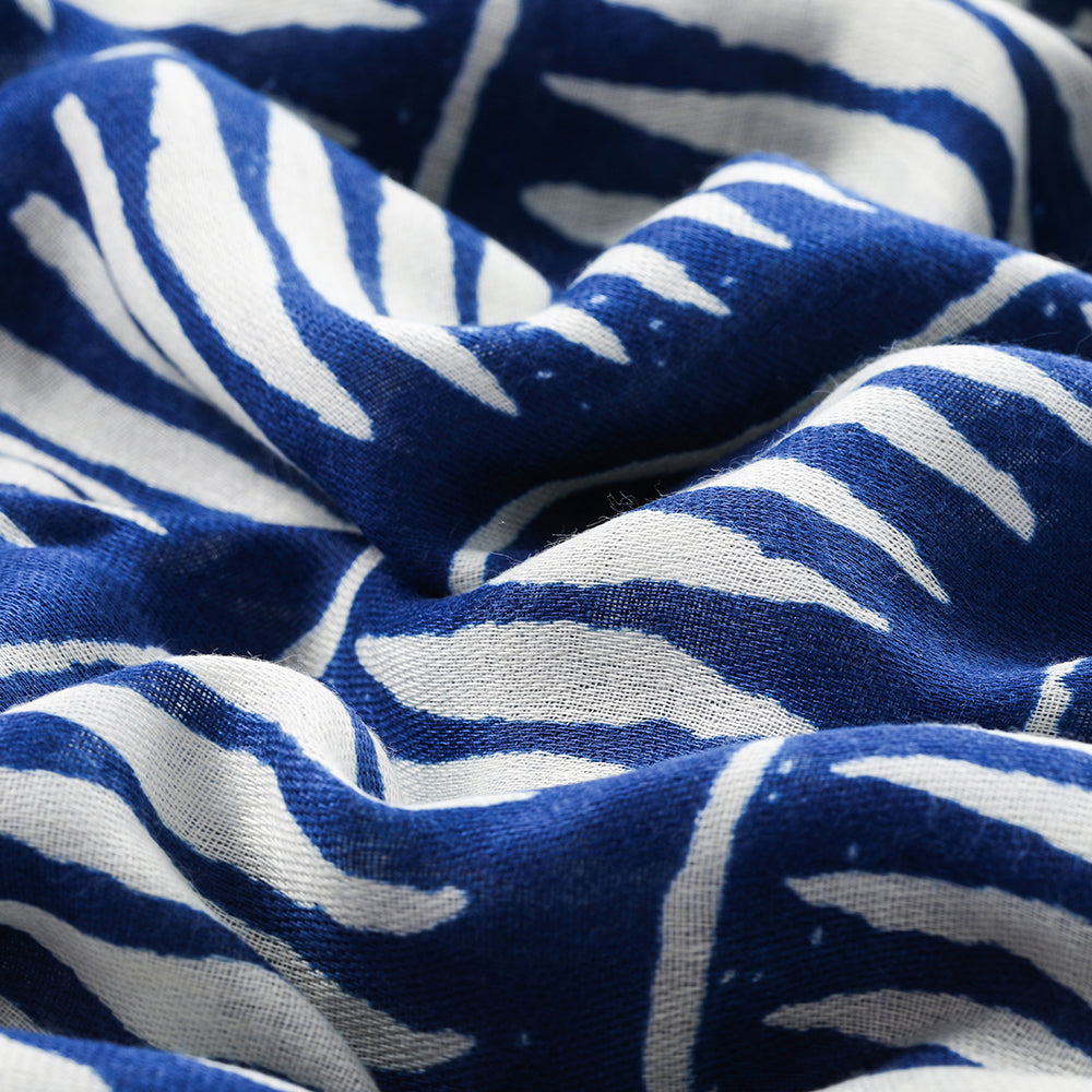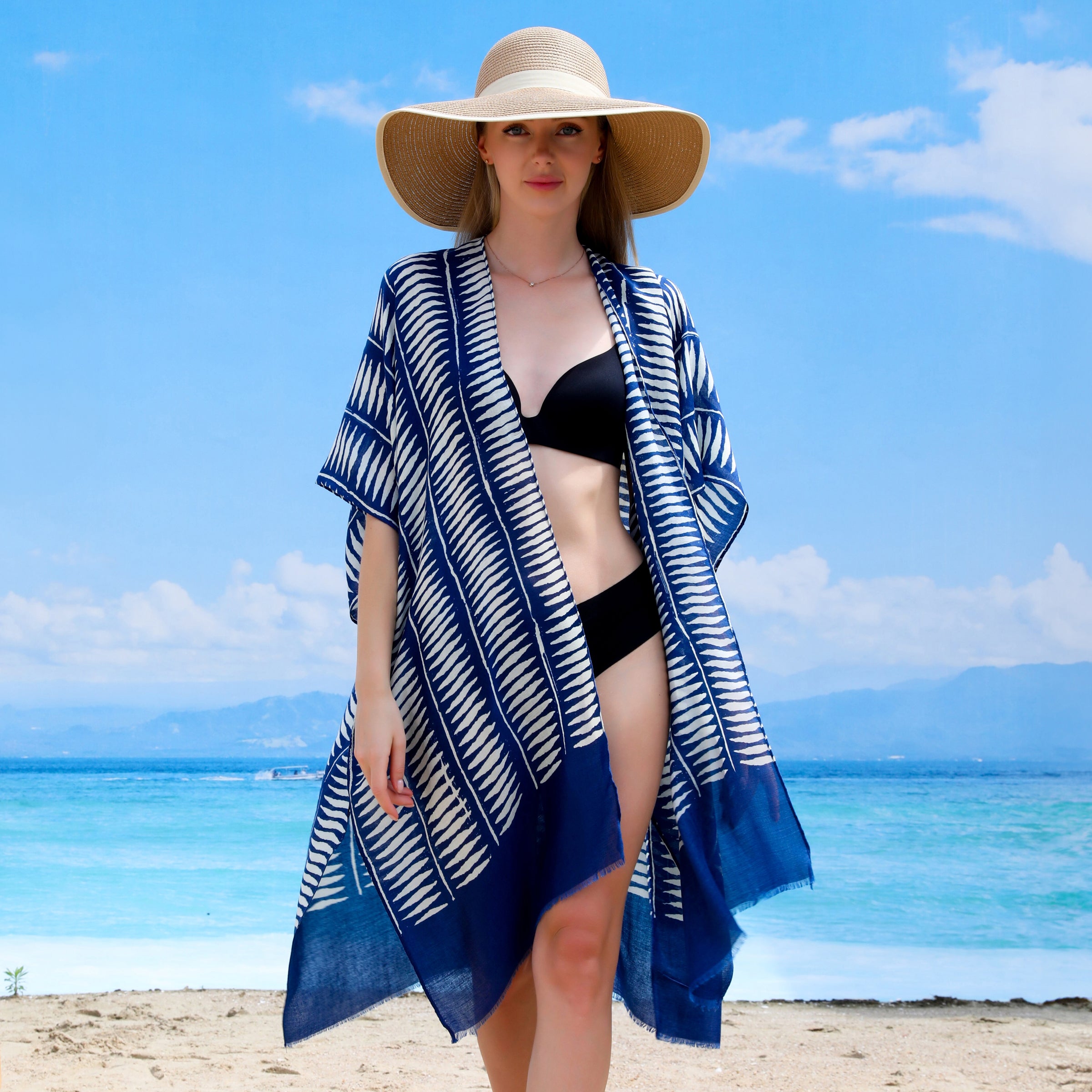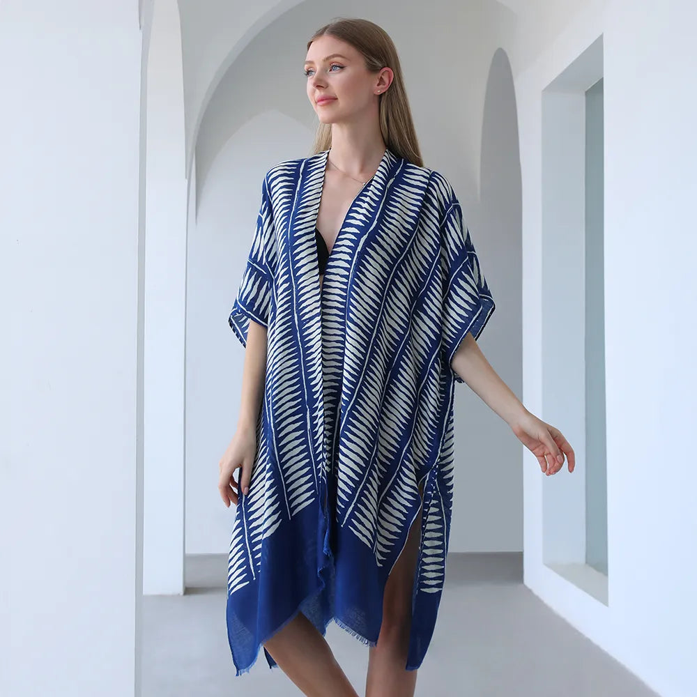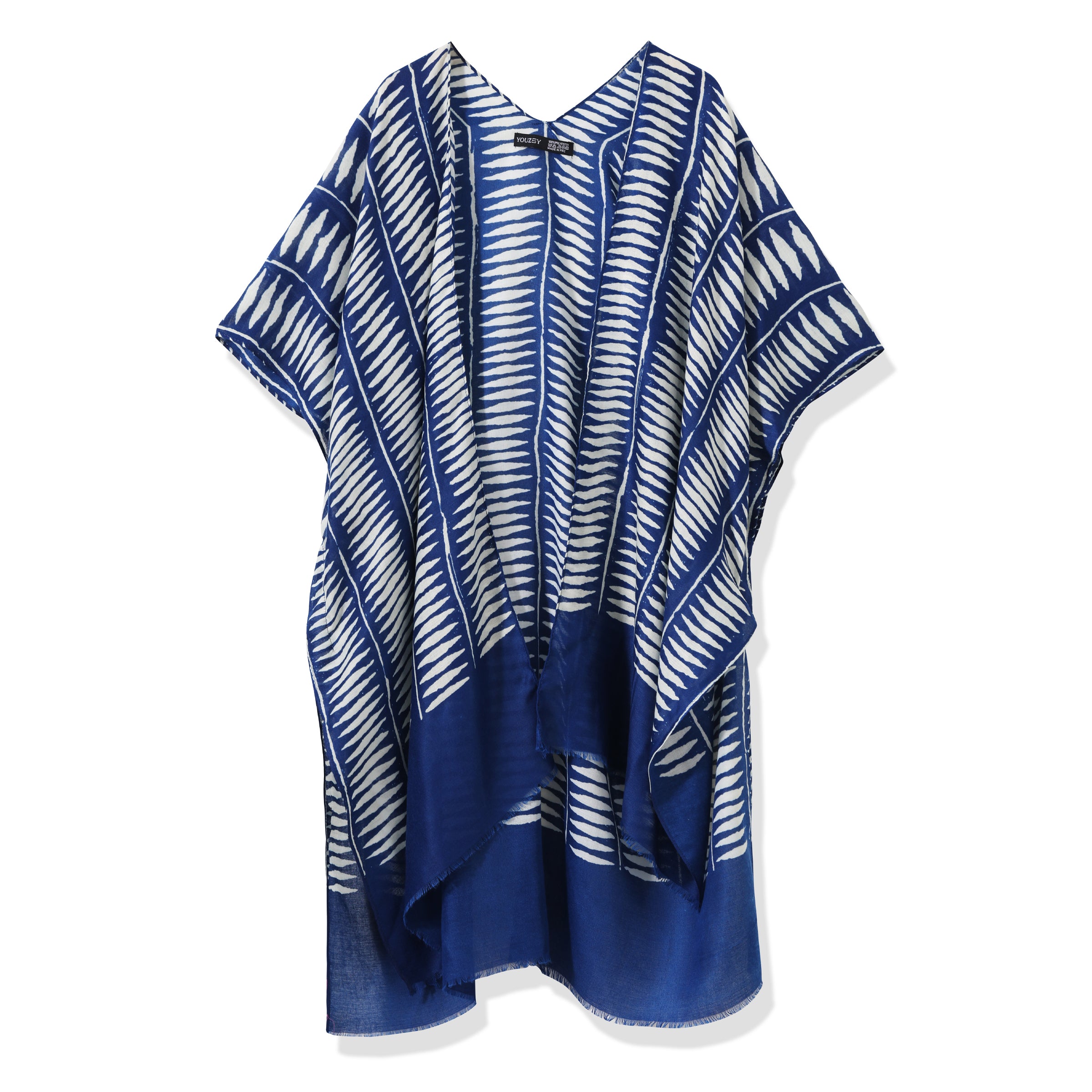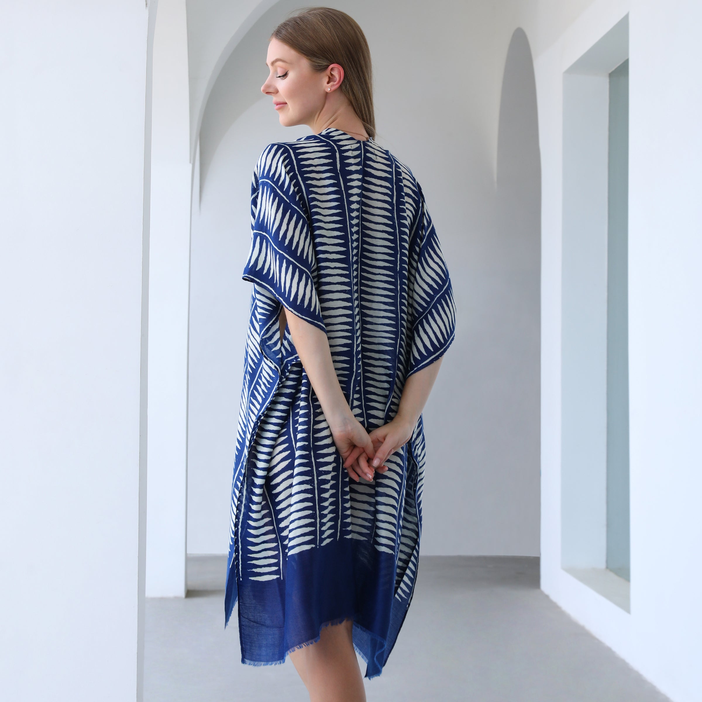 White modern leaves on a navy background with a bold navy border give this topper a fresh, classic look. Great over leggings or jeans and terrific for travel. Lightweight and easy to wear!