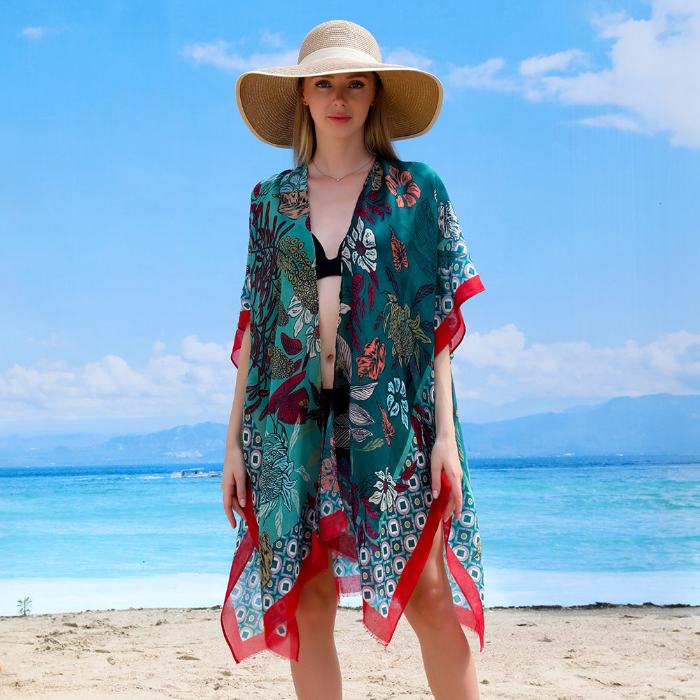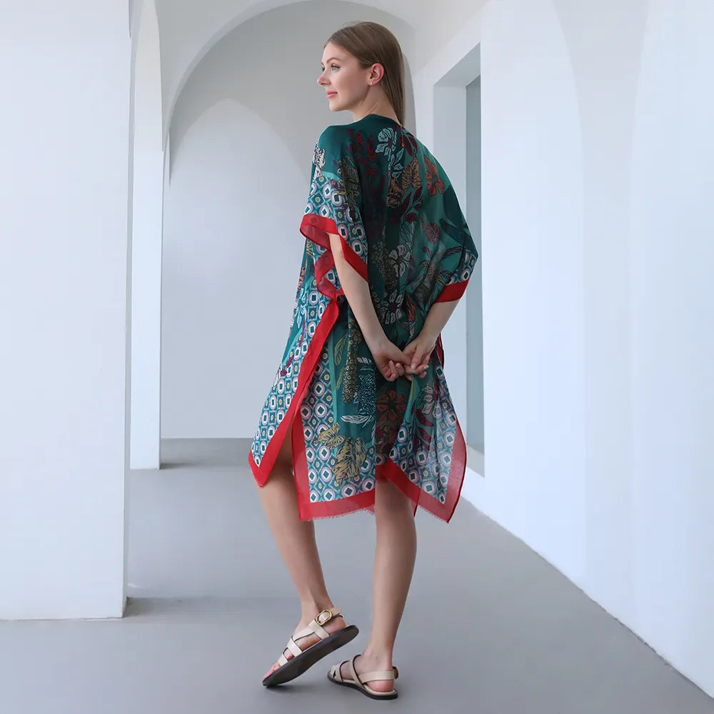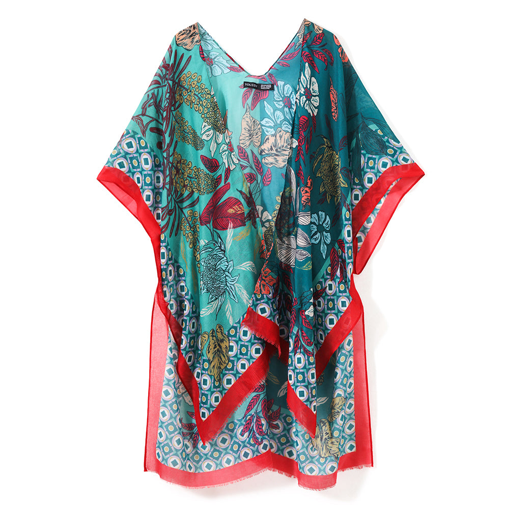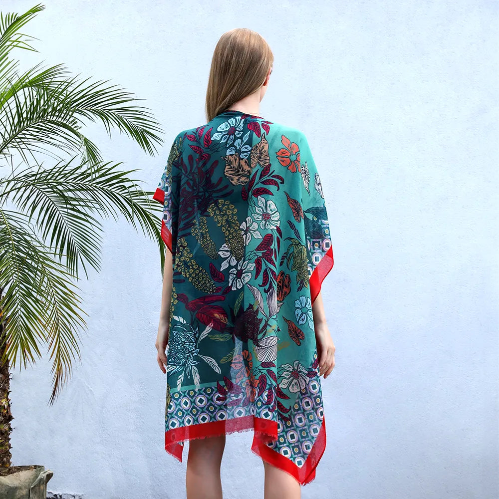 Colorful flowers and patterns on a blue background make this topper a great addition to any wardrobe. Looks fantastic over jeans or leggings. Bright red border with short fringe detail at the bottom, creates definition and pop!. Great for travel. Lightweight and easy to wear!