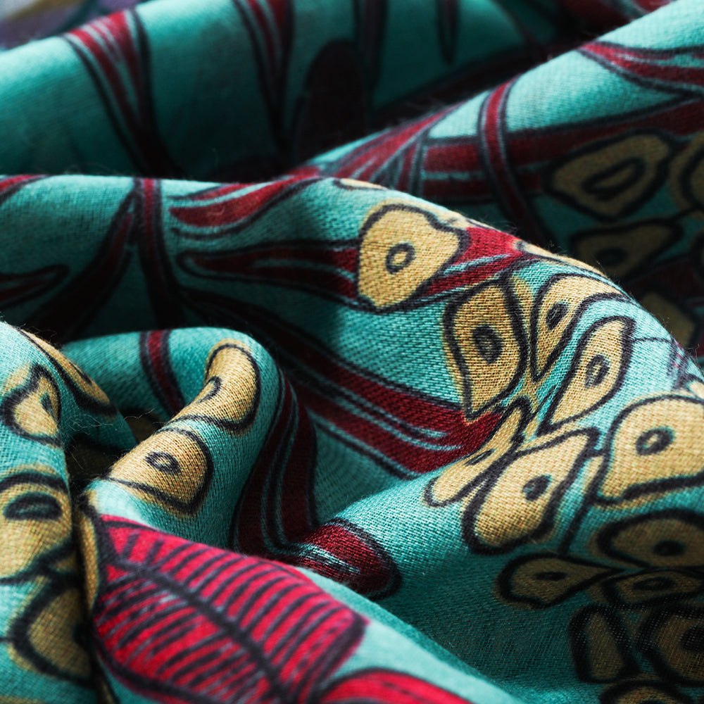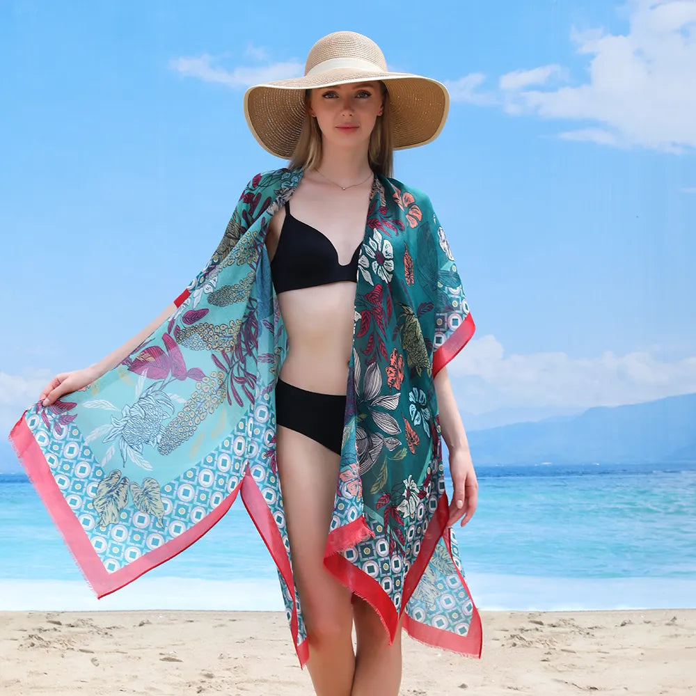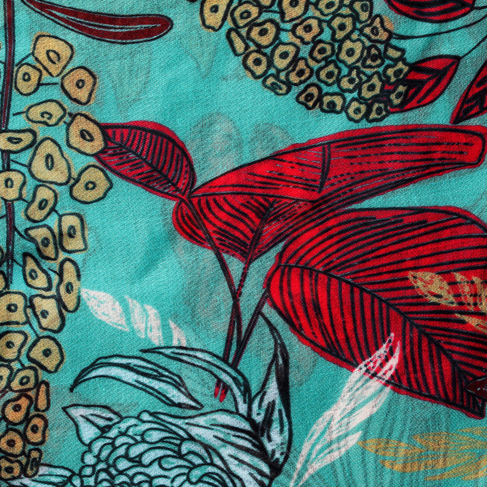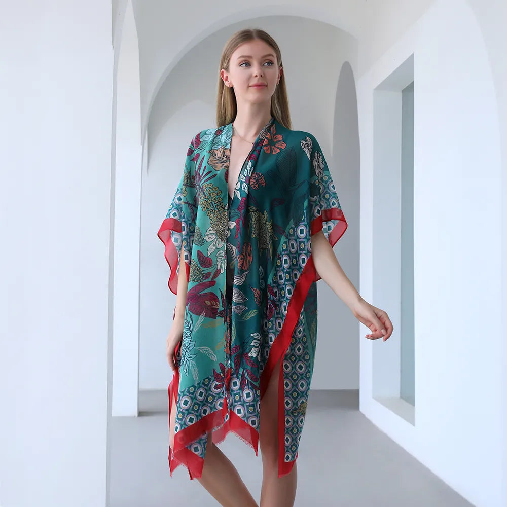 Colorful flowers and patterns on a blue background make this topper a great addition to any wardrobe. Looks fantastic over jeans or leggings. Bright red border with short fringe detail at the bottom, creates definition and pop!. Great for travel. Lightweight and easy to wear!