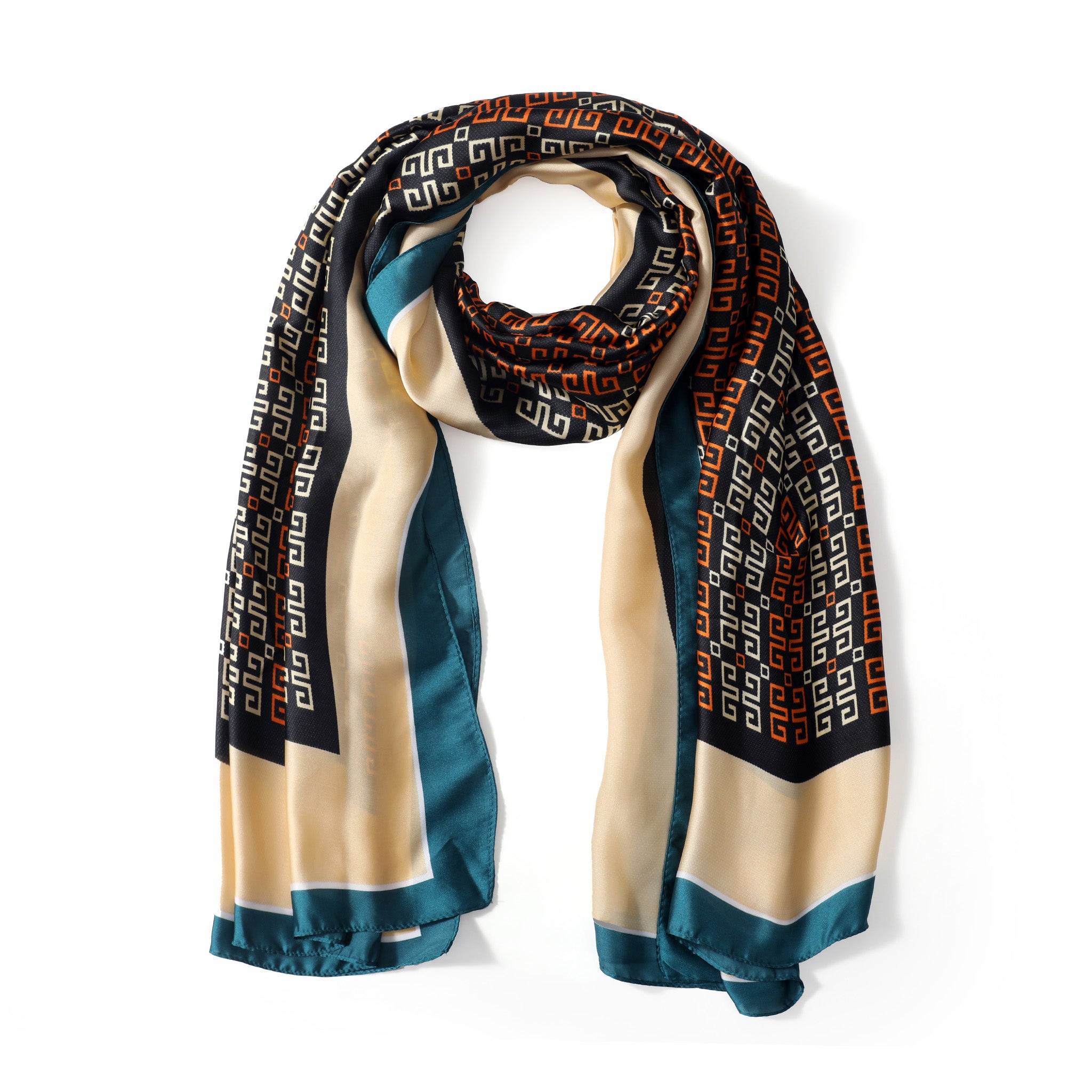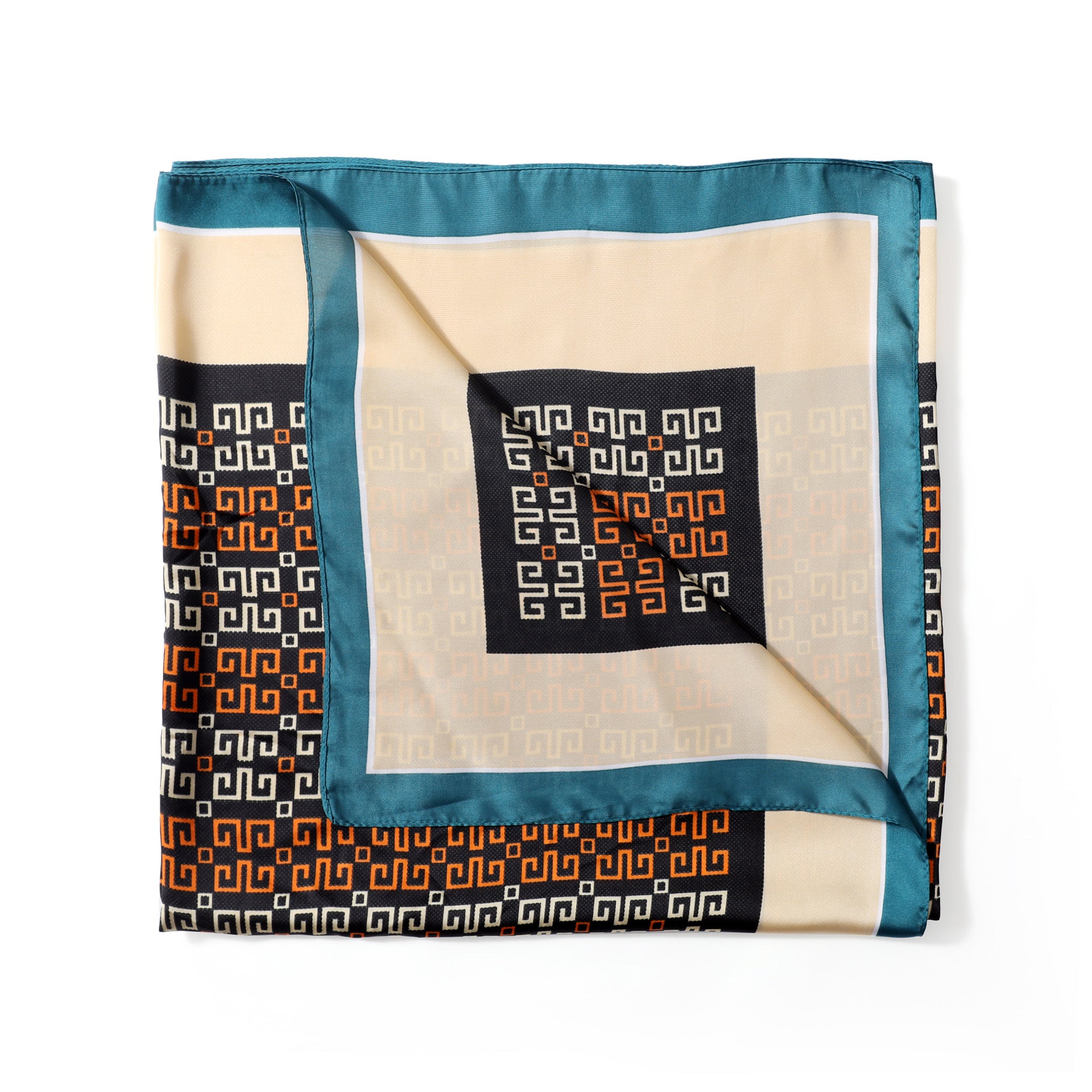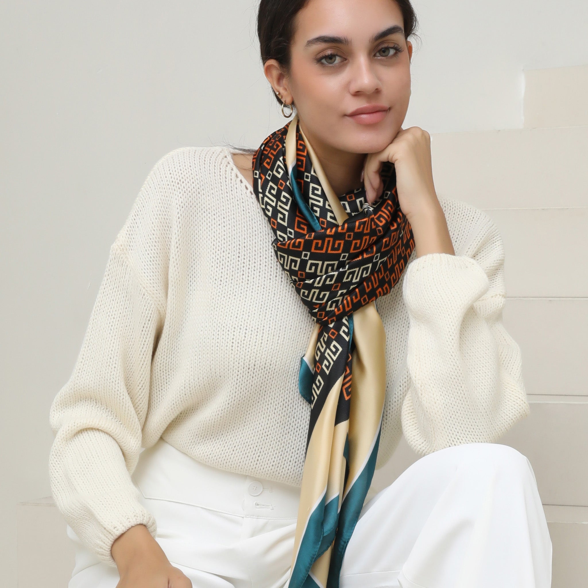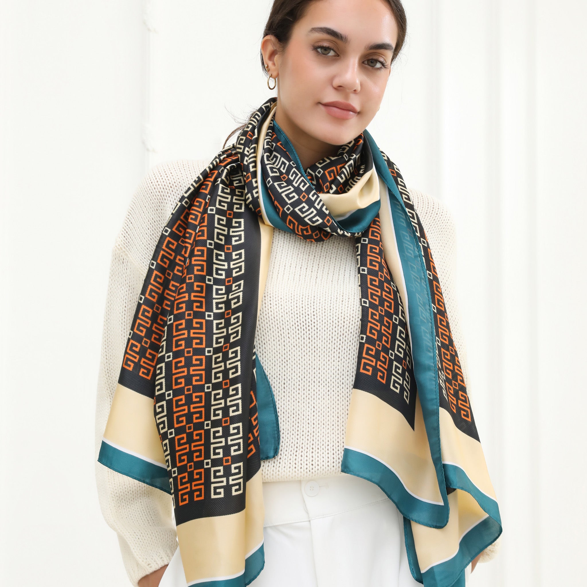 With its lightweight design and elegant muted teal and cream border, this scarf adds a classic touch that's both trendy and timeless.