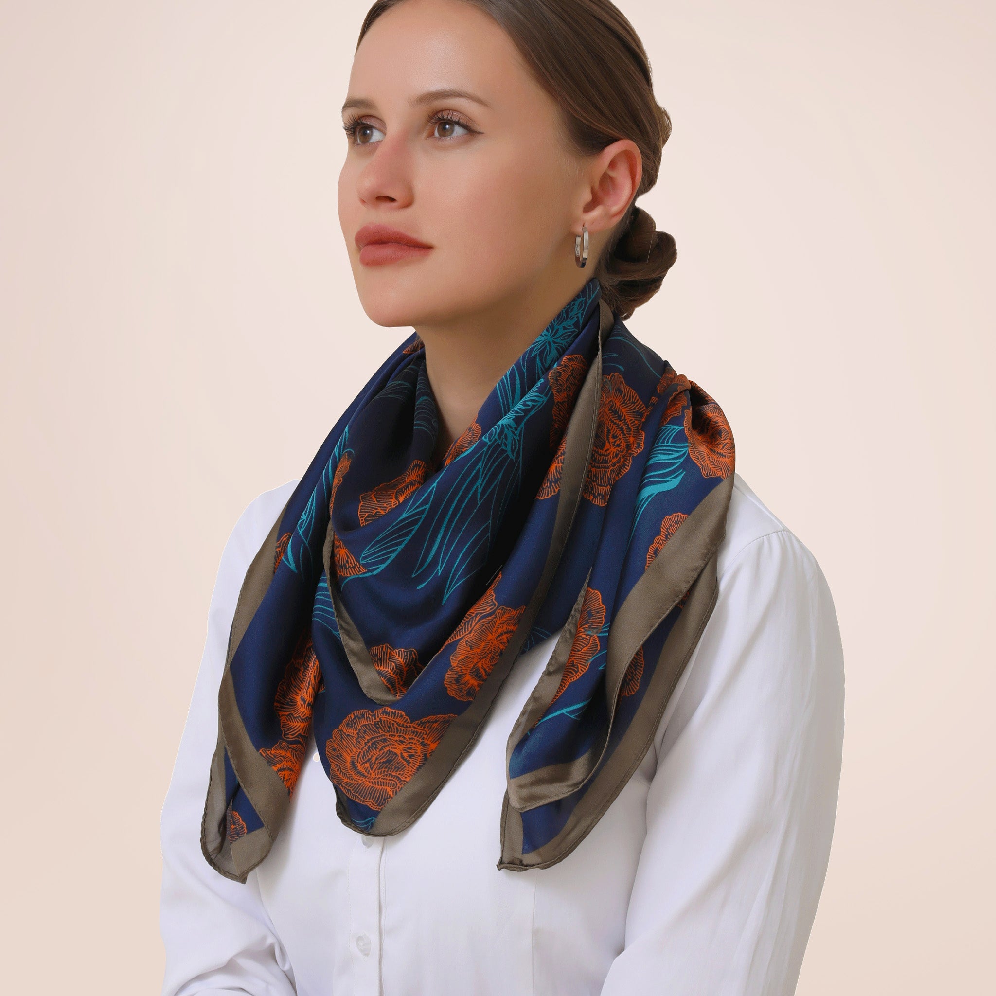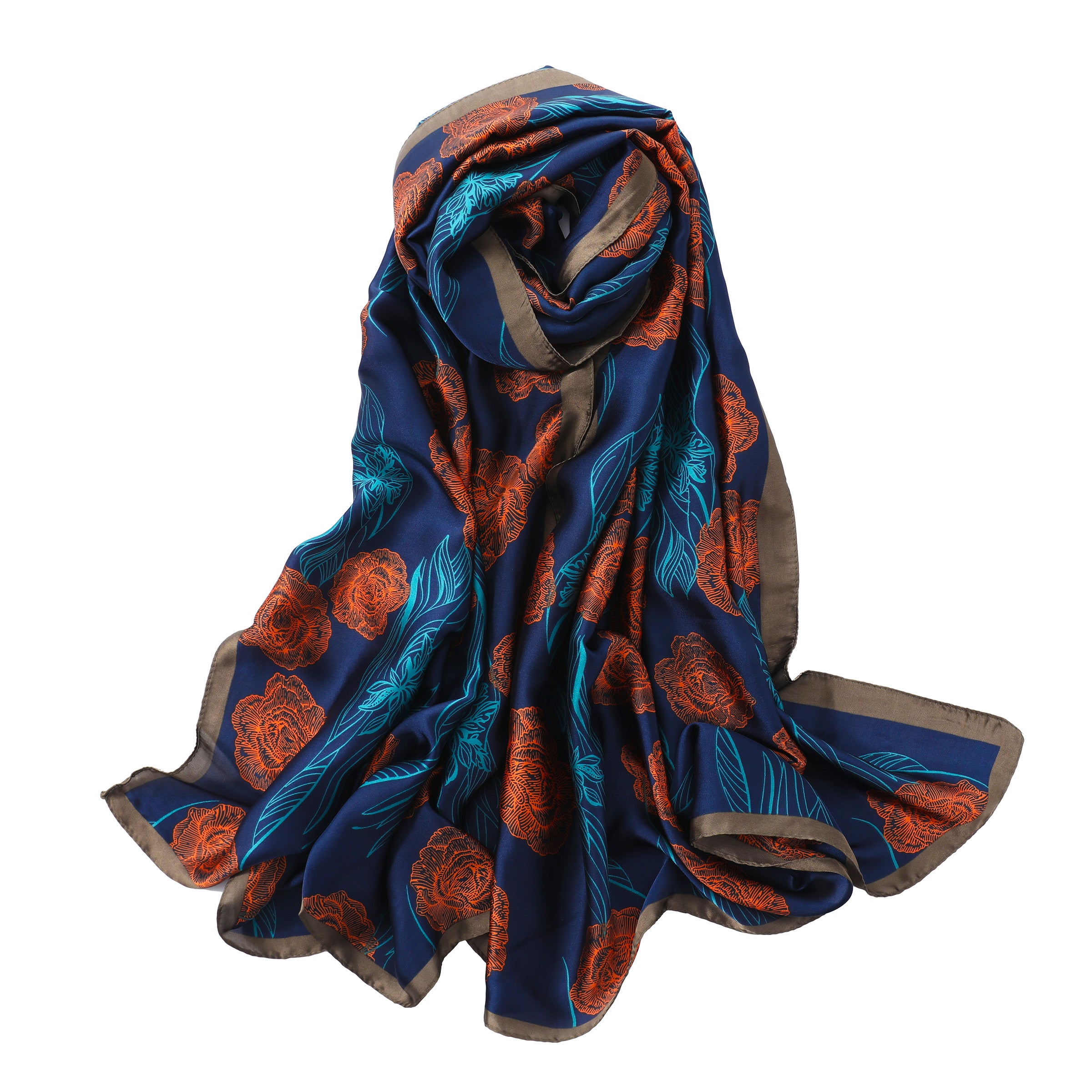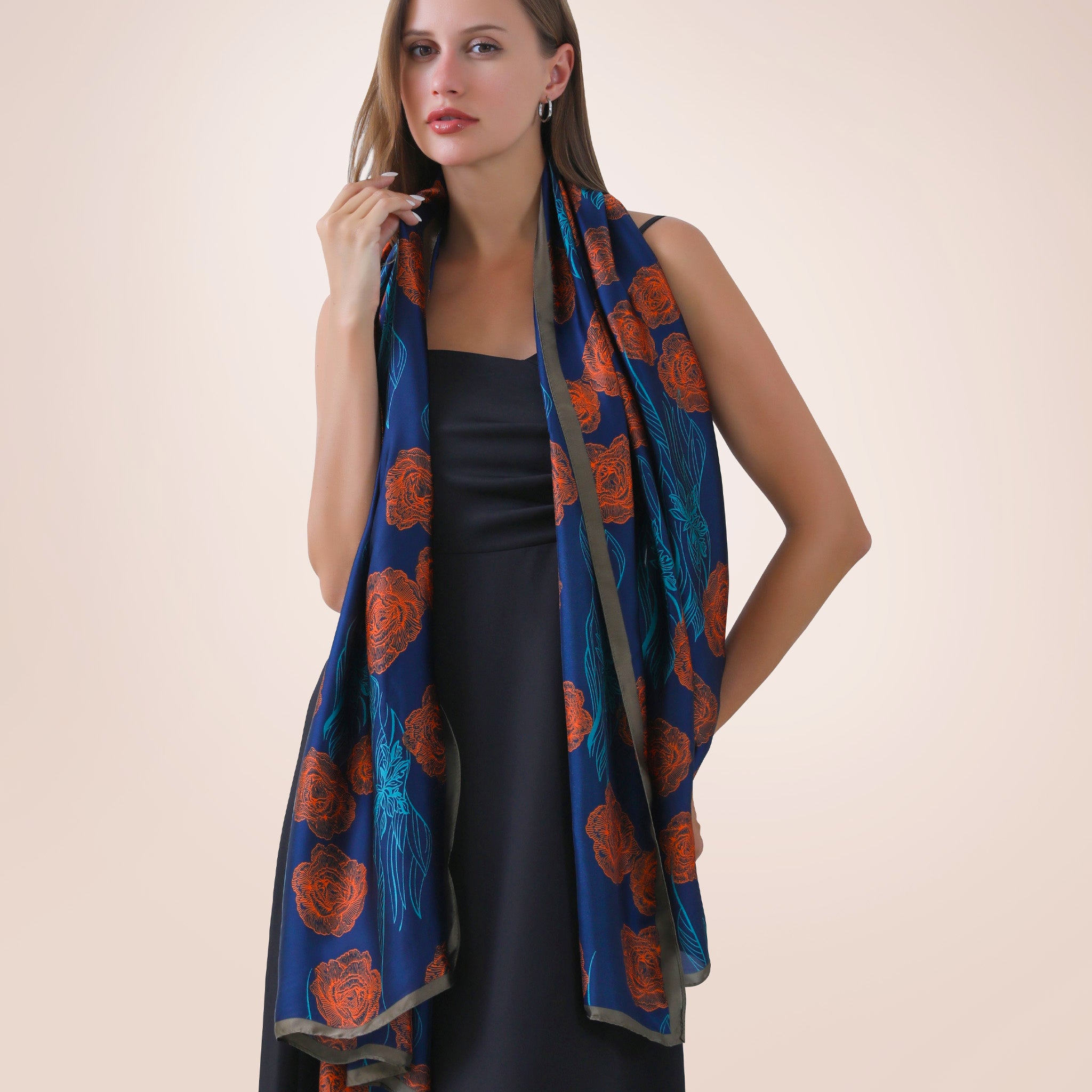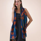 Rich royal blue background and modern orange roses make this scarf a true standout in every wardrobe. Looks great with dresses, pantsuits or under a coat. The soft, silky feel will make this scarf one of your favorites.