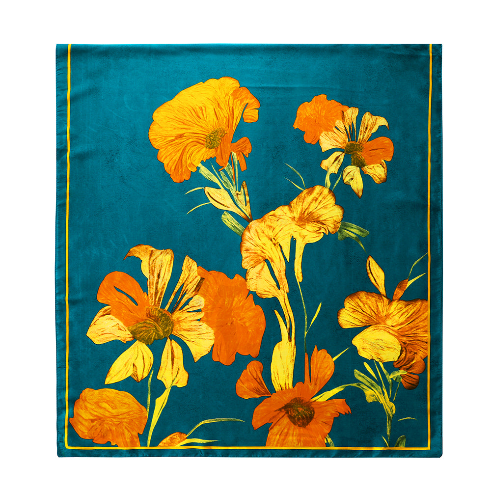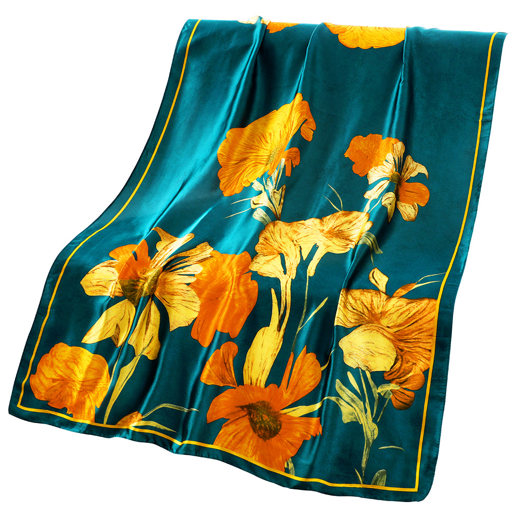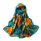Brighten up your wardrobe with this stunning teal scarf adorned with vibrant gold and orange floral details. Made from luxuriously soft faux silk, it feels dreamy against your skin while being lightweight and breathable for year-round wear. Its generous size (31"W x 69"L) makes it perfect for styling in endless ways. Whether you’re jet-setting to a new destination, adding a pop of color to spring outfits, or accessorizing your favorite coat, this scarf is your ultimate versatile companion.