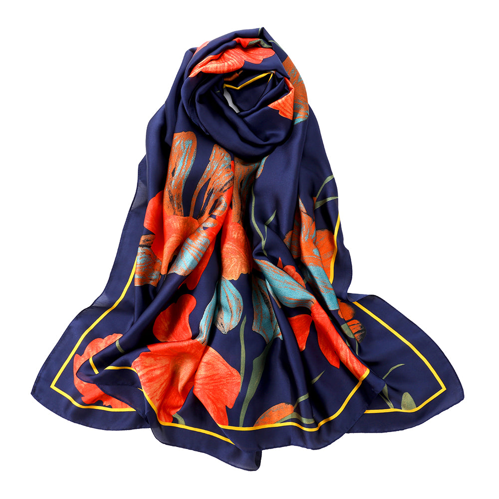 This beautiful blue scarf with orange flowers adds style to any outfit or coat. Luxurious faux silk feels great on skin; 100% polyester fabric makes cleaning simple.