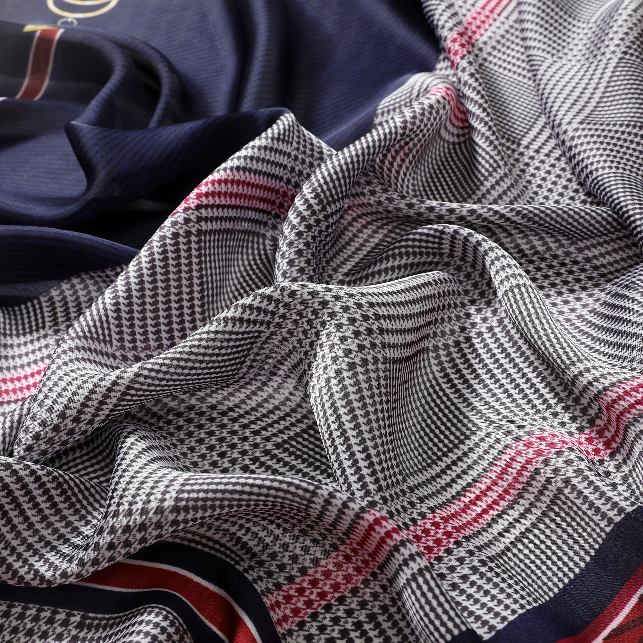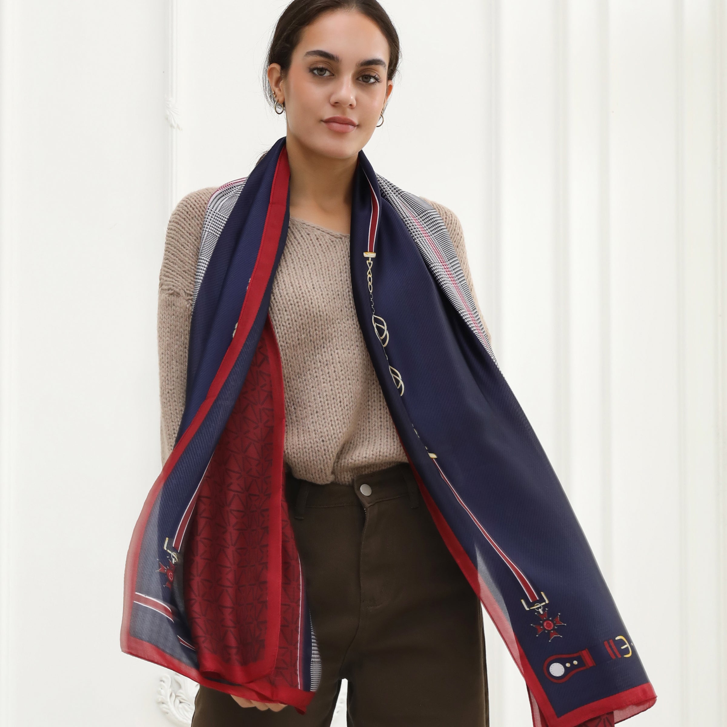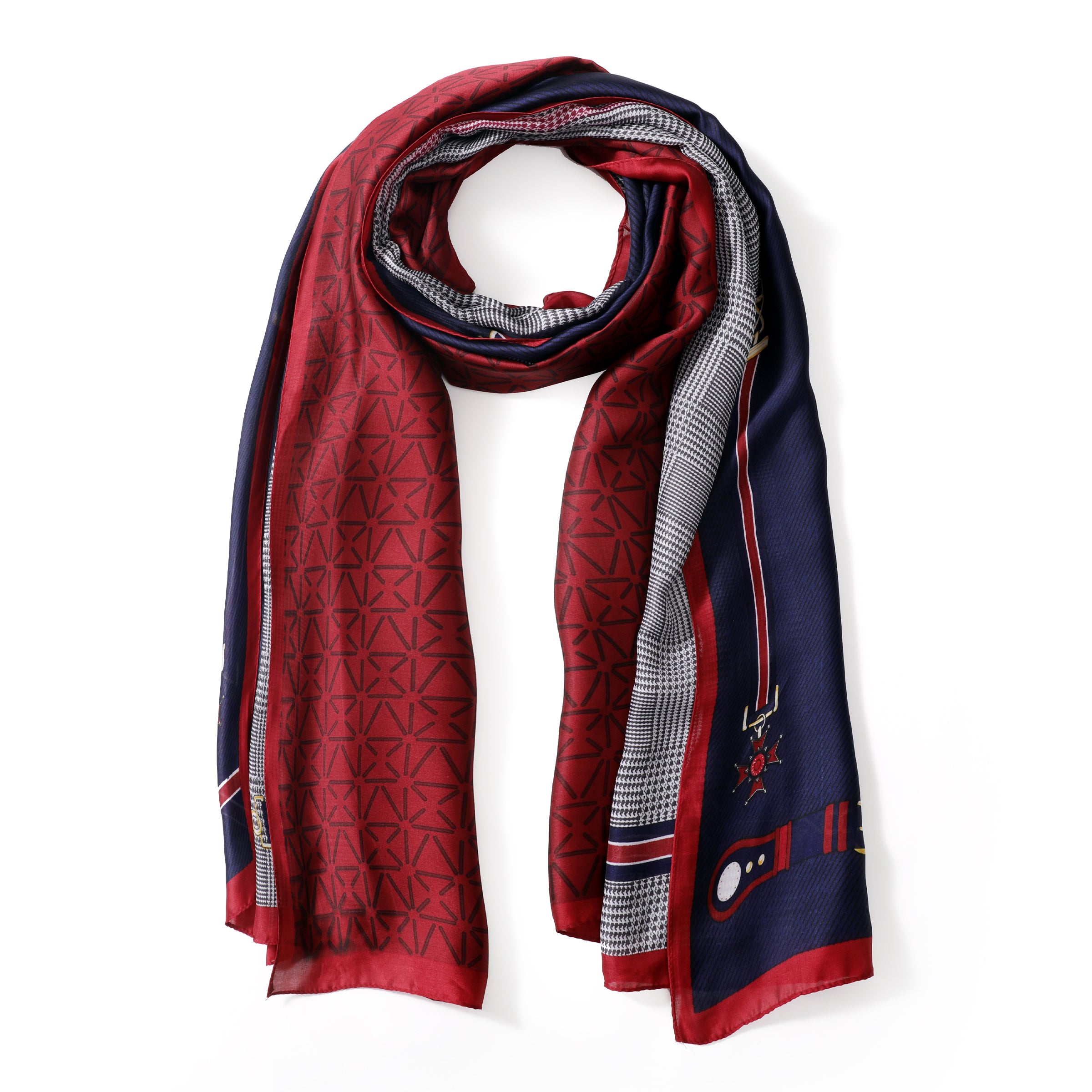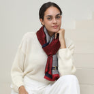 The Ava lightweight scarf is crafted to elevate your wardrobe with effortless grace. As a vibrant scarf adorned in classic red and navy tones, Ava is the ideal companion whether you're off to a casual brunch or an important meeting. With an intricate herringbone pattern, enriched with timeless designs, this scarf adds a dash of sophistication to any outfit you choose. While it boasts a luxurious appearance, the lightweight and packable nature means you can easily slip the scarf into your luggage, making it the perfect choice for your travel adventures. Allow Ava, to be your go-to accessory for all your styling needs, bringing classic charm and modern elegance to your wardrobe.