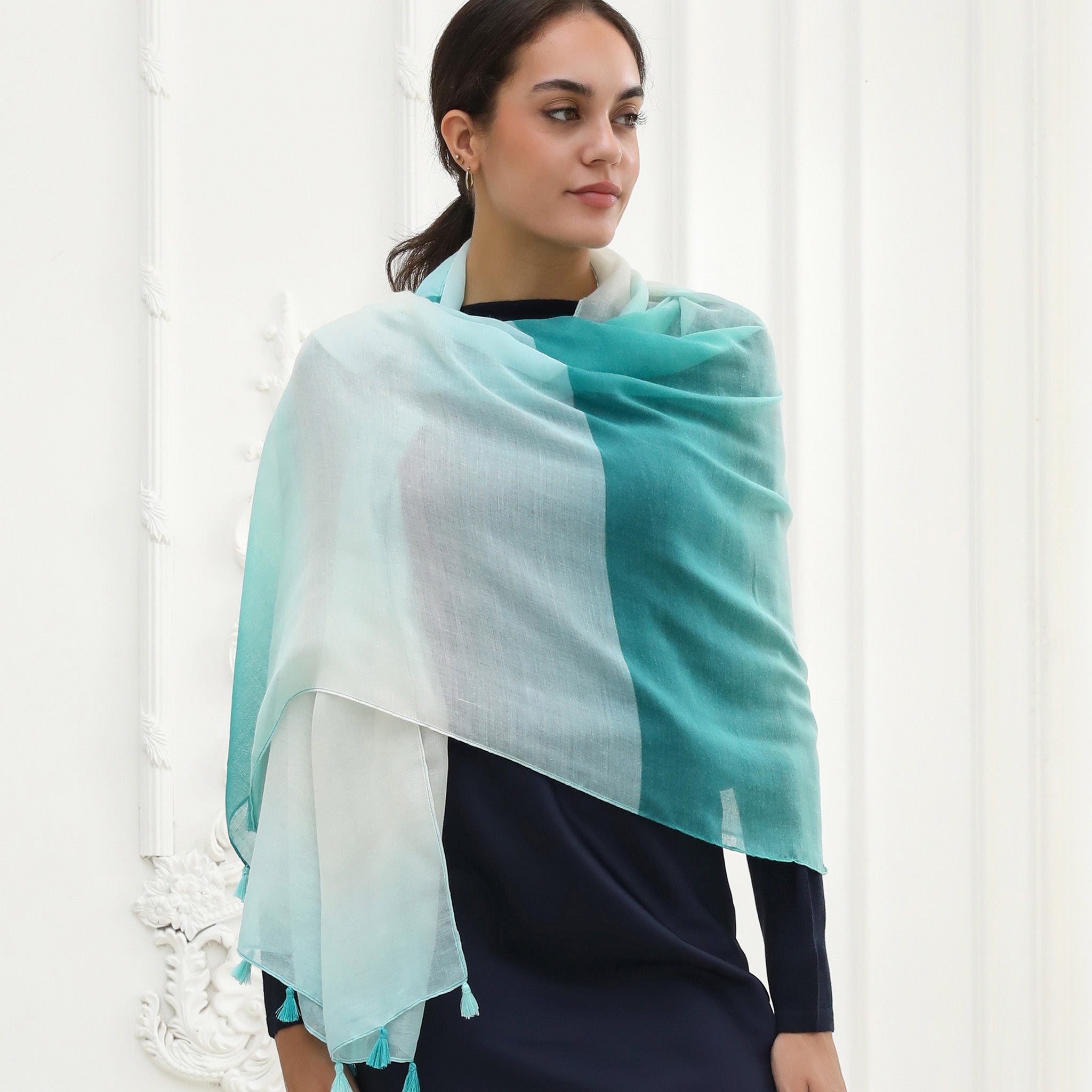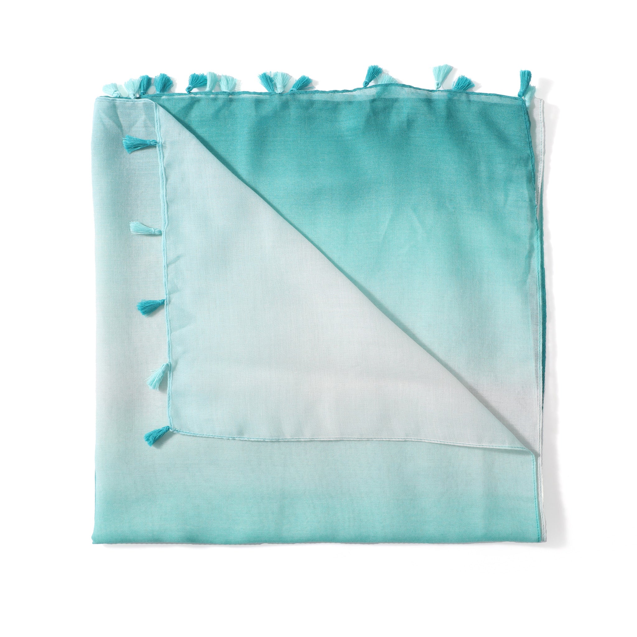 Inspired by dreamy coastal getaways, this lightweight and luxuriously soft accessory transitions from crisp white to tranquil teal blue, exuding elegance and carefree charm. Whether you're strolling along the shoreline or stepping into spring with a fresh outfit, this scarf adds the perfect touch of flair and functionality.