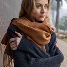 The scarf's beautiful fringe adds a touch of fun and sophistication to any outfit, making it perfect for both casual and formal occasions. Its generous dimensions of 75x24" provide ample coverage, allowing you to drape, wrap, or knot it in countless ways to suit your personal style. Available in a variety of stunning color combinations, including sage and tan, cranberry and light red, and blue and gray, this reversible pashmina scarf offers versatility that complements any wardrobe.
