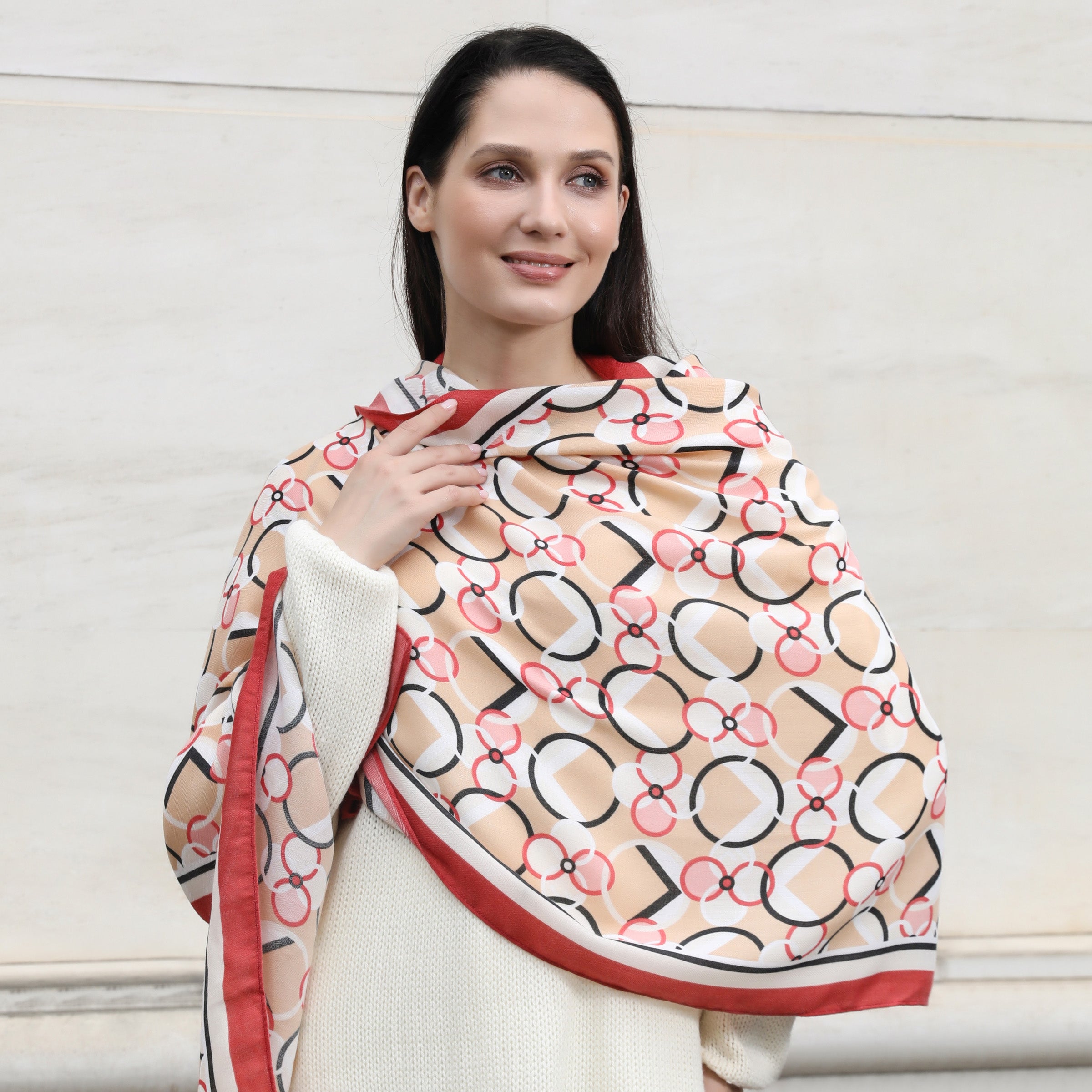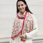 Playful meets polished in The Allison, a lightweight scarf designed to turn heads. With its modern circle pattern in warm pink, tan, and black tones, this scarf is a fun and sophisticated way to elevate your look. The silky finish and tailored border give it a luxe touch, whether draped loosely, knotted, or wrapped. The Allison is a statement piece that’s as versatile as it is eye-catching.