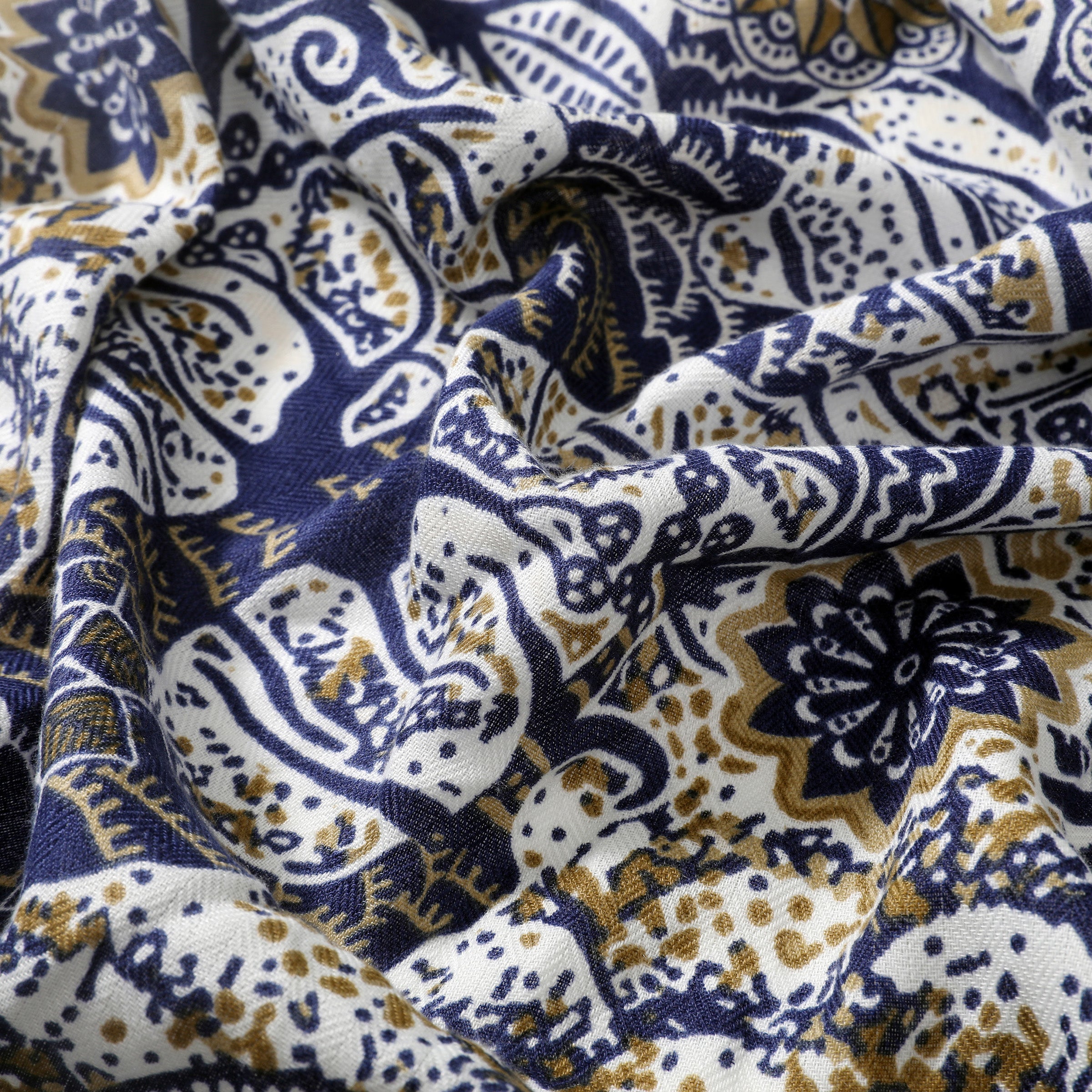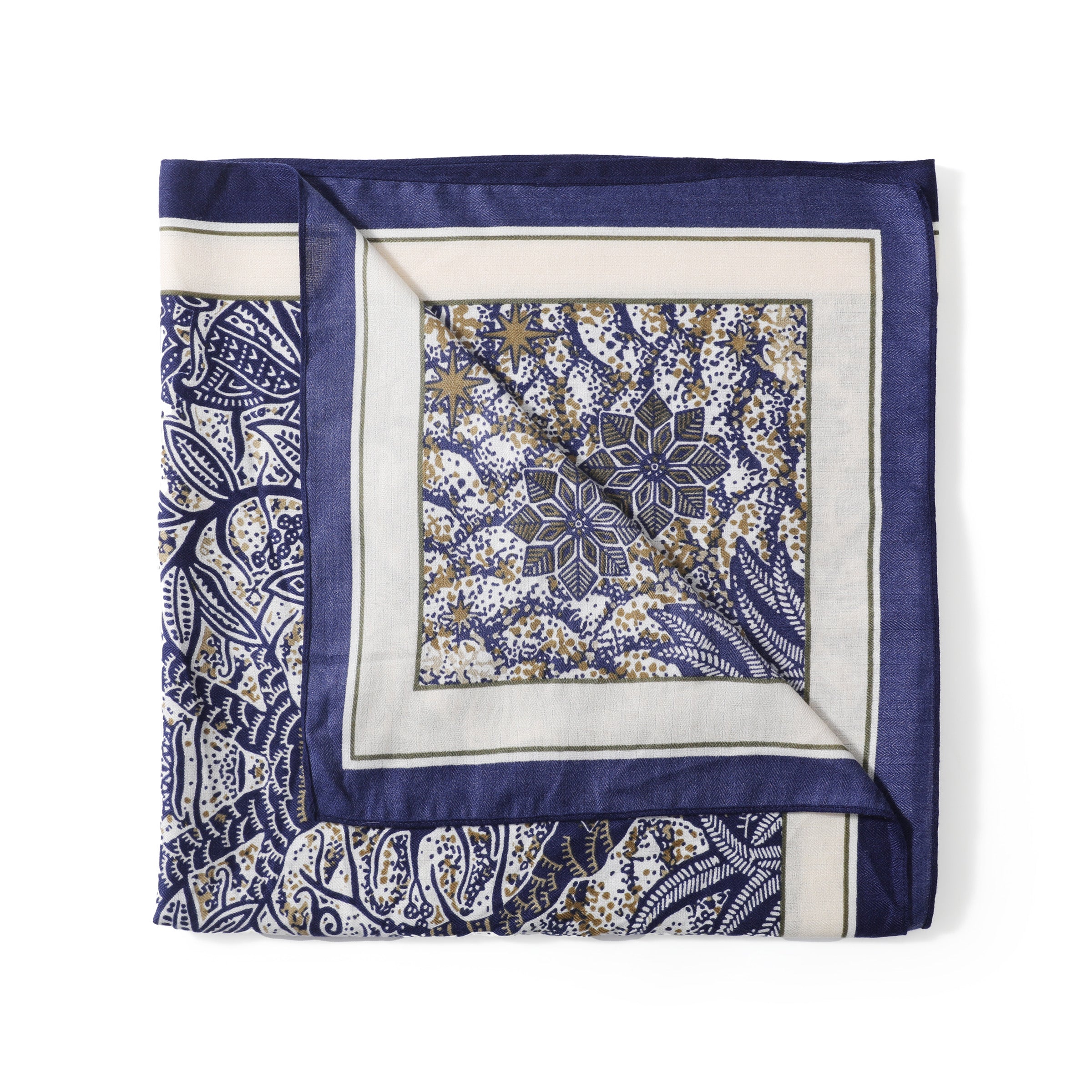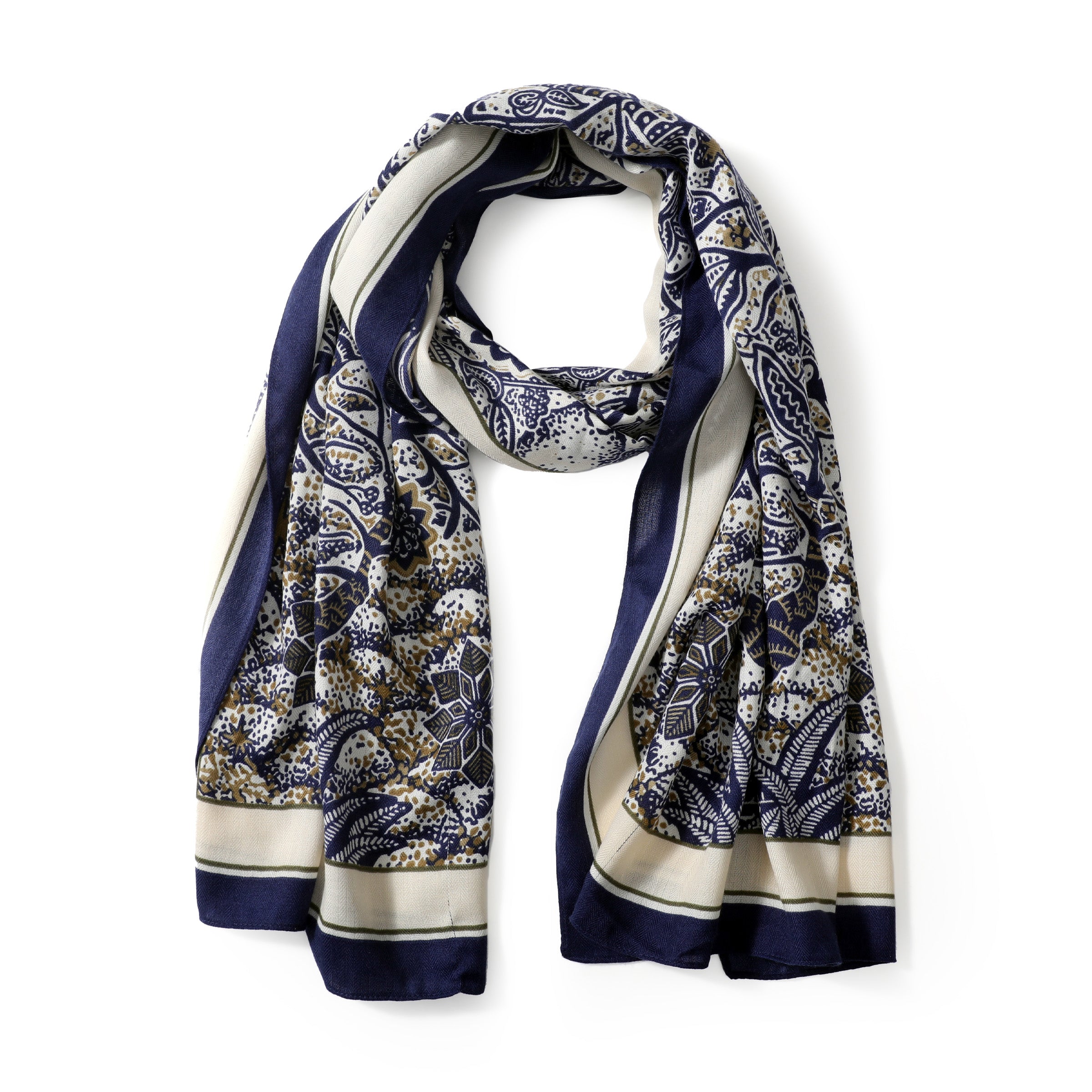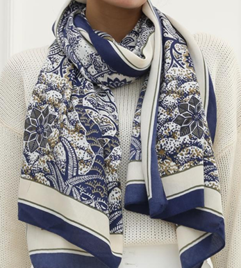 Elevate your everyday style with The Kate, a beautifully lightweight scarf that blends sophistication with comfort. This elegant piece drapes effortlessly and adds a refined touch to any outfit. The intricate blue and cream floral pattern is framed by bold navy borders, making it a standout accessory for both casual and dressier looks. Perfect for year-round wear, The Kate is your go-to for layering in style.