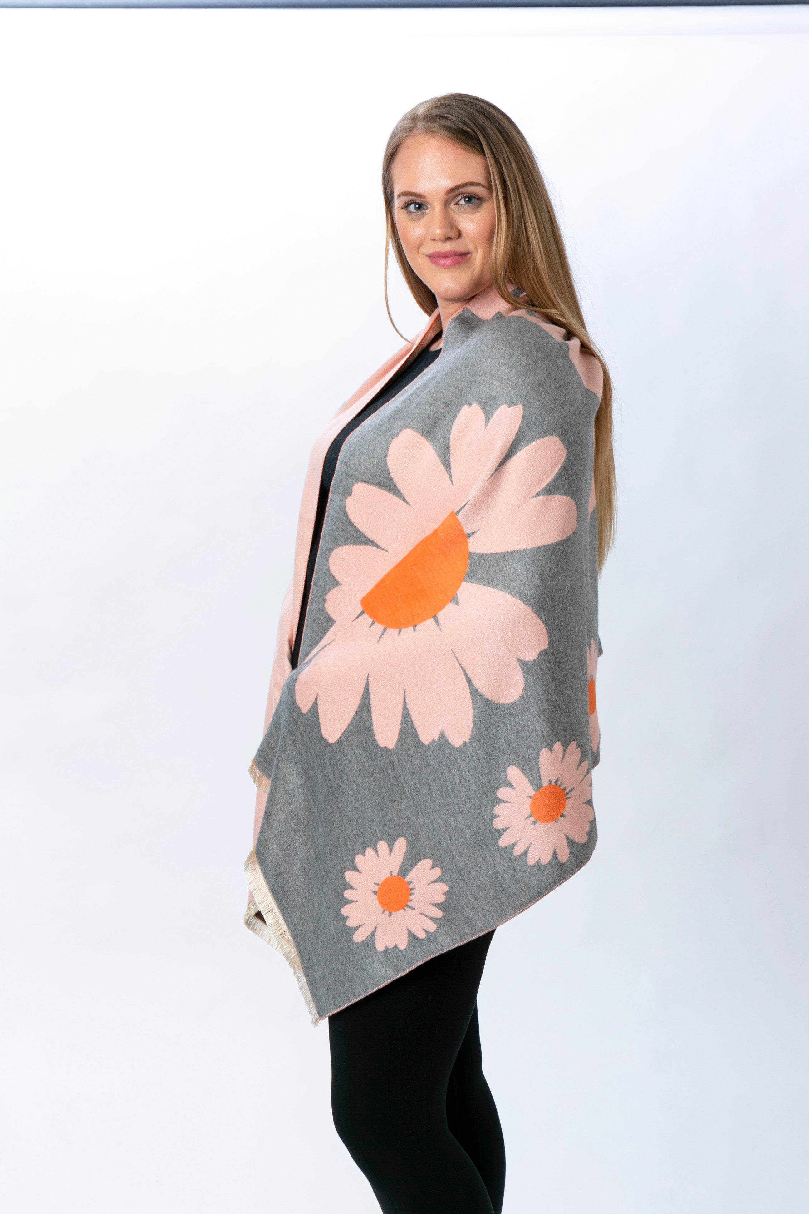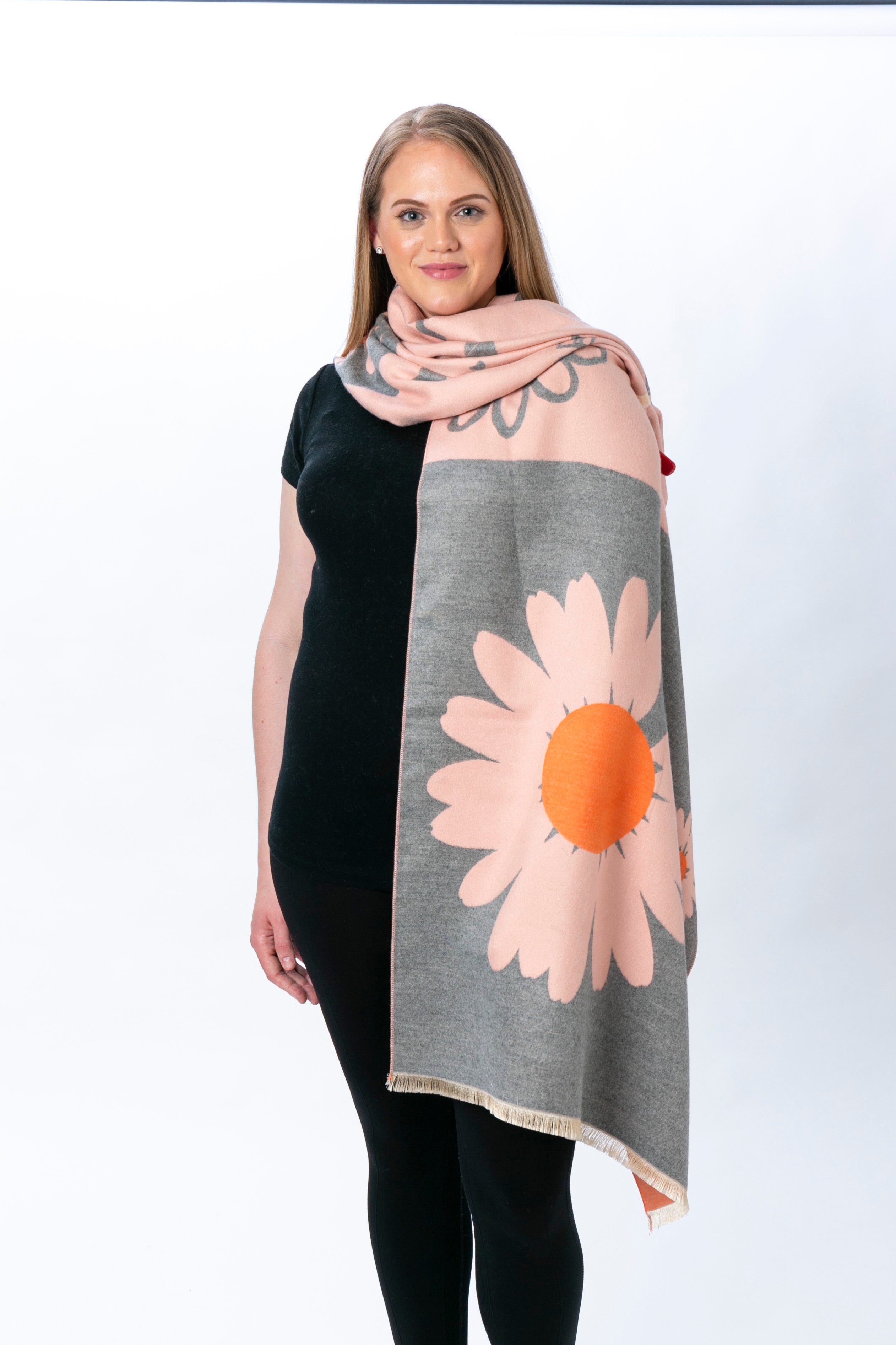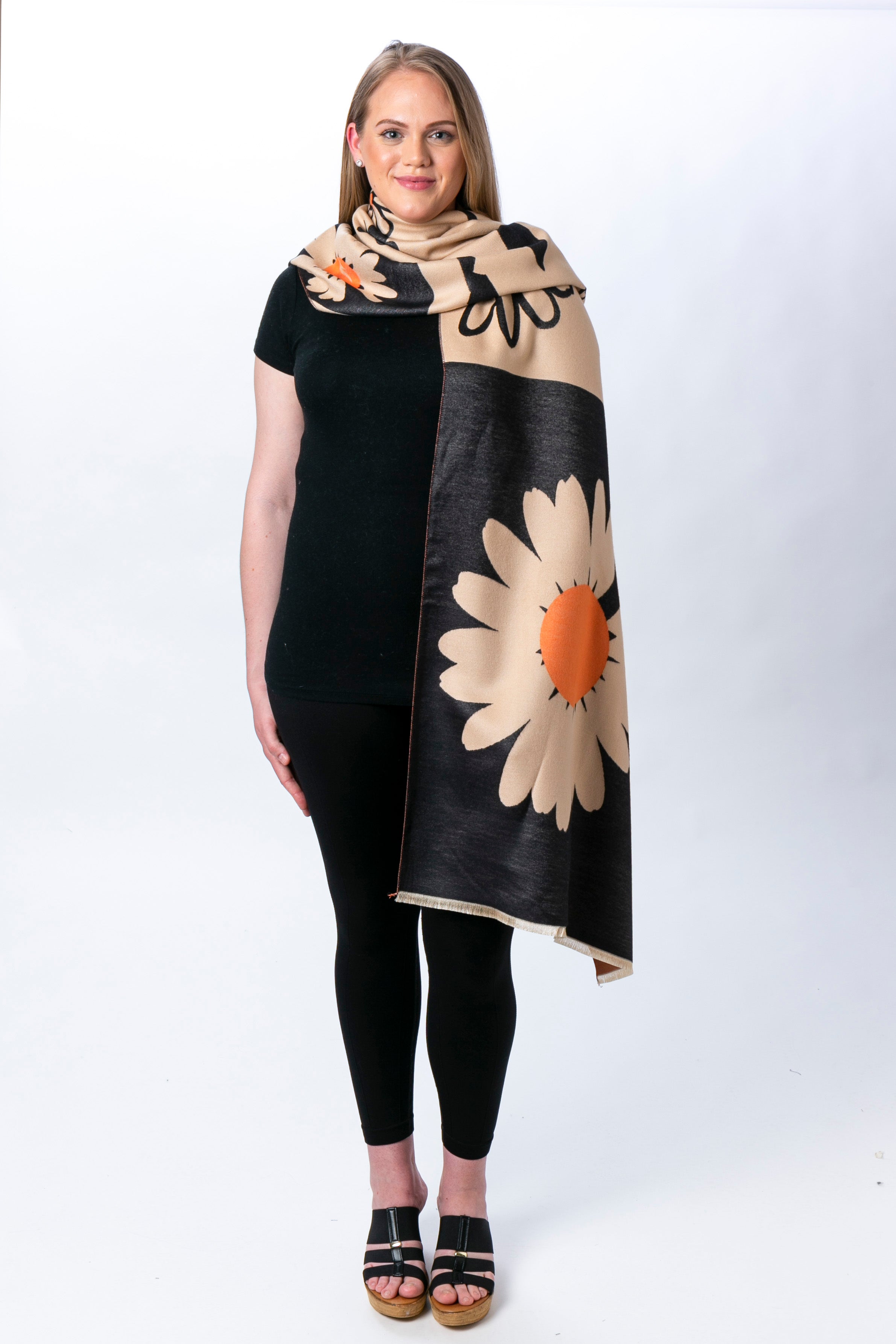 This large, luxurious, butter-soft pashmina is our TOP SELLER. Bold and beautiful with daisy graphics, you'll stay warm and looking fabulous Fall, Winter and even early Spring. Available in 4 color varieties.