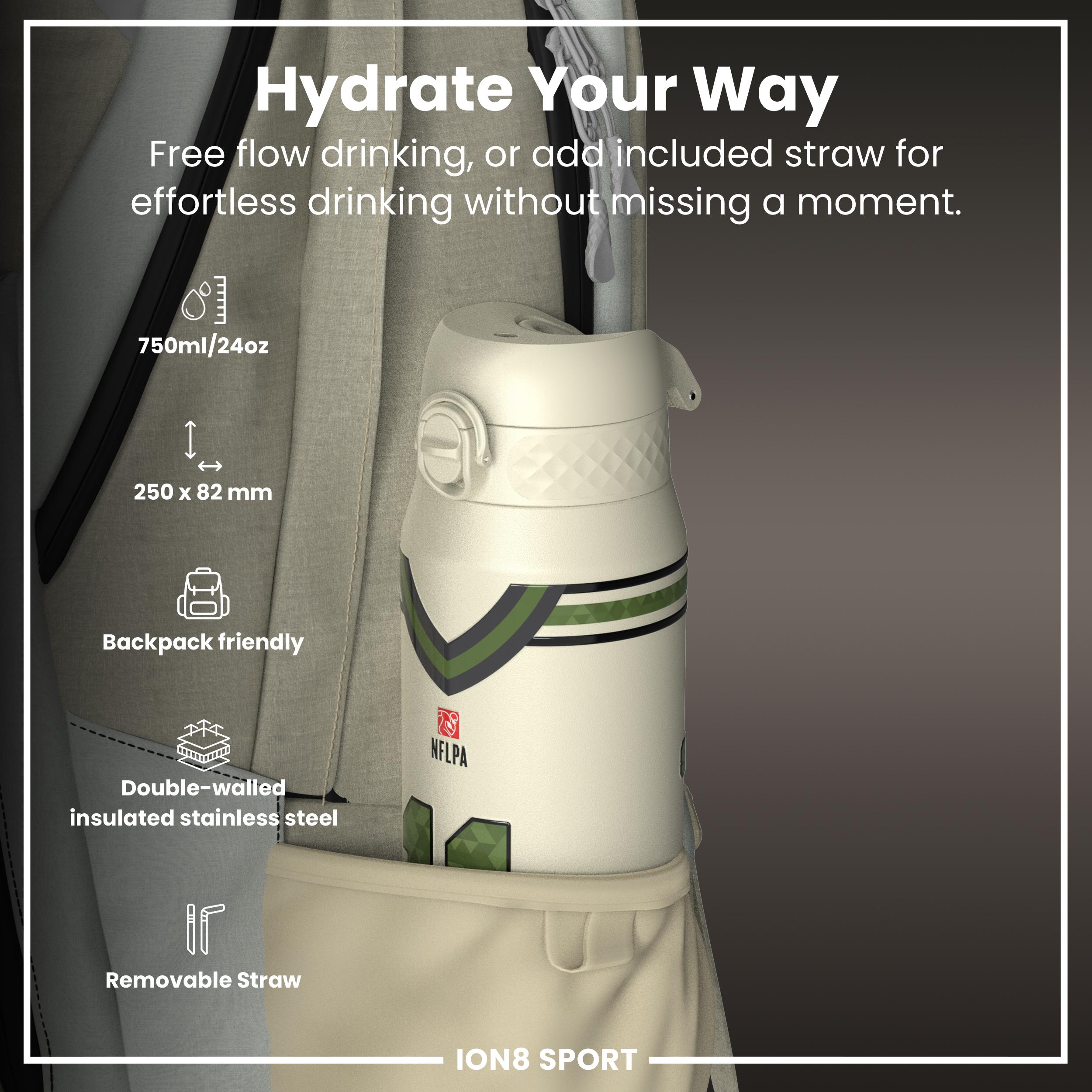 Start your journey towards hydration with a sleek, innovative water bottle that fits effortlessly into your busy routine. Whether you're hitting the gym, heading to the office, or embarking on an outdoor adventure, this stylish vessel is designed to keep your beverages at the desired temperature, thanks to its double-walled stainless steel construction. The convenient flip-top design makes staying refreshed a breeze, allowing for one-handed operation so you can keep moving with ease. From Ion8.This bottle has an added special feature as this bottle features Jaxon Smith-Njigba, number and photo.