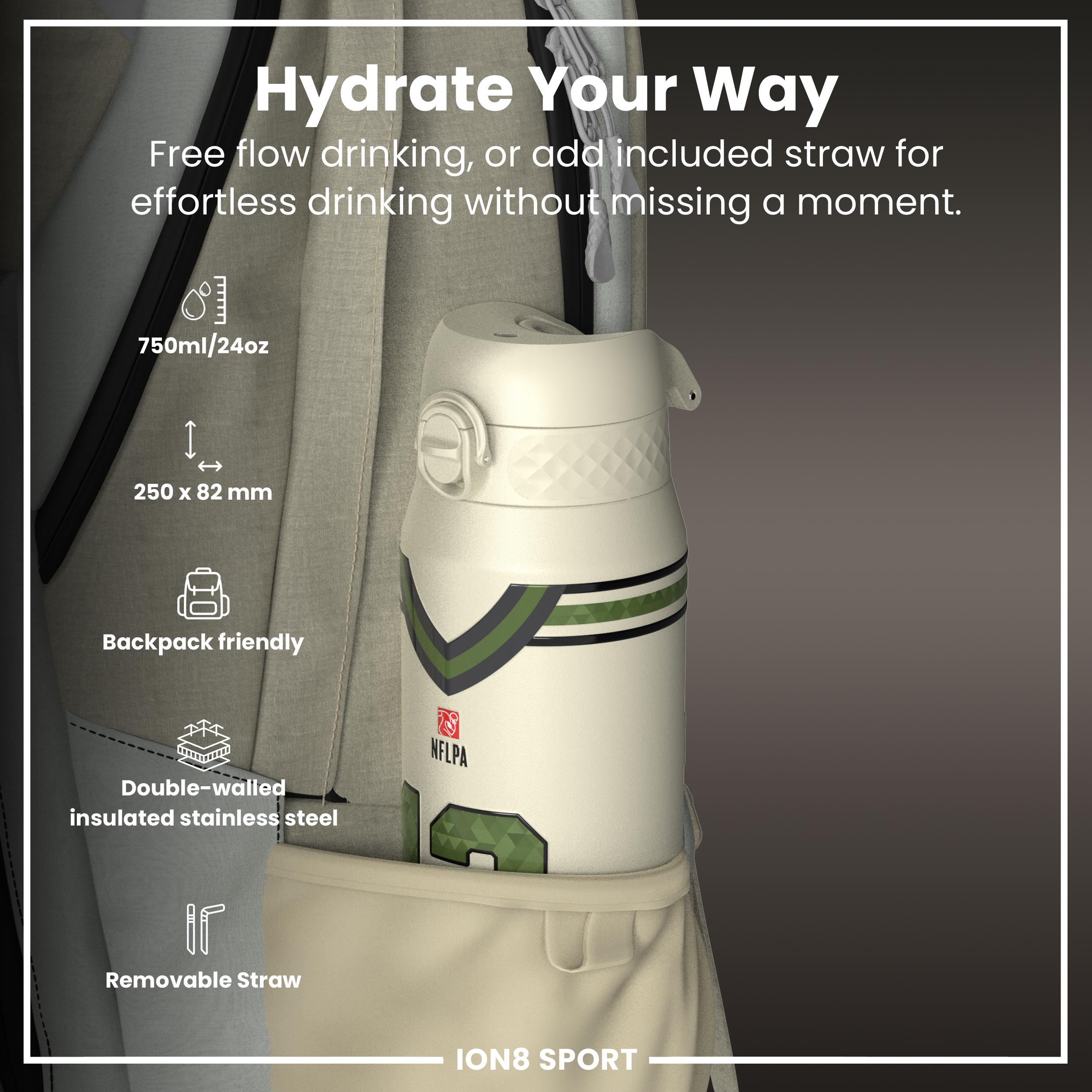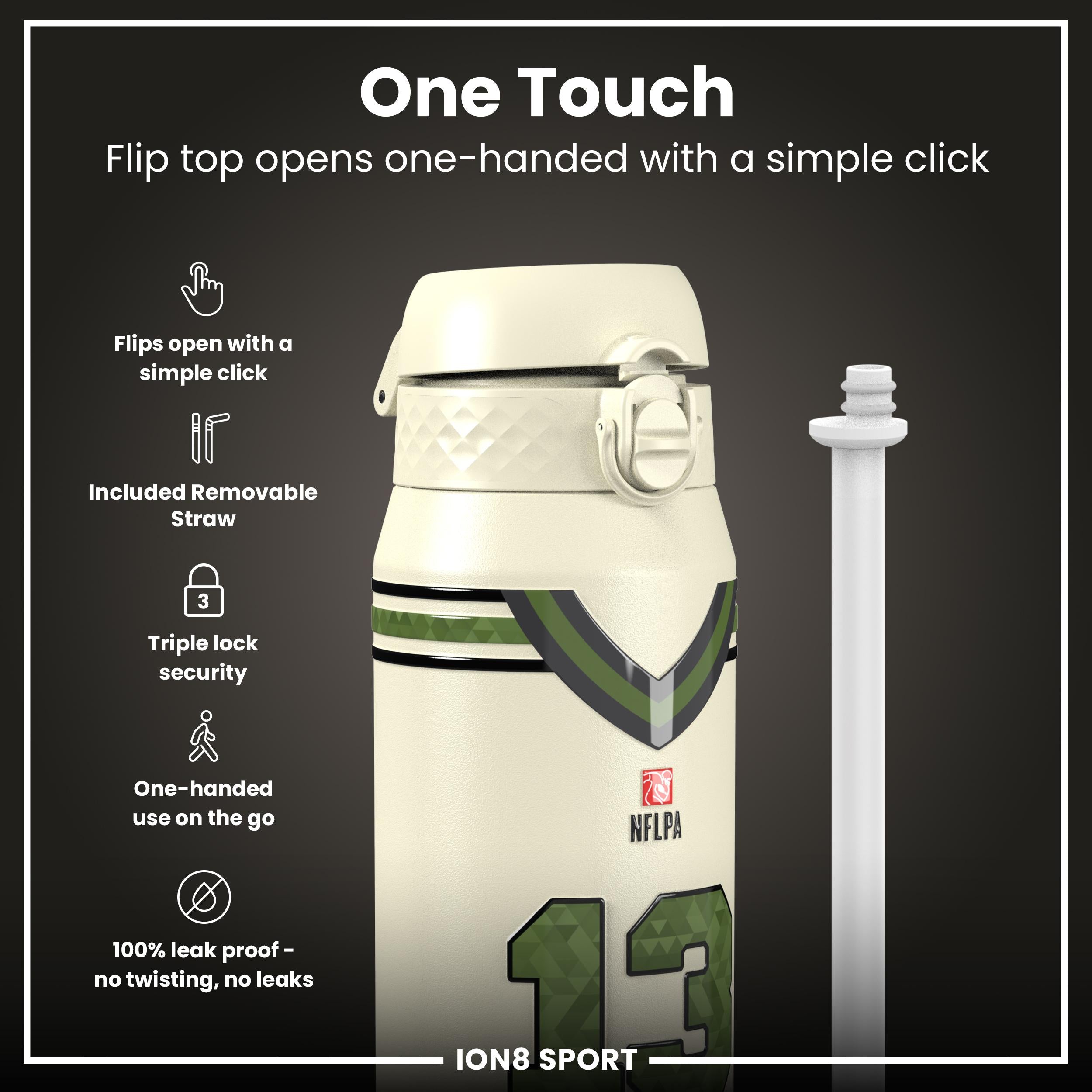 Start your journey towards hydration with a sleek, innovative water bottle that fits effortlessly into your busy routine. Whether you're hitting the gym, heading to the office, or embarking on an outdoor adventure, this stylish vessel is designed to keep your beverages at the desired temperature, thanks to its double-walled stainless steel construction. The convenient flip-top design makes staying refreshed a breeze, allowing for one-handed operation so you can keep moving with ease. From Ion8.This bottle has an added special feature as this bottle features Mike Evans, number and photo.
