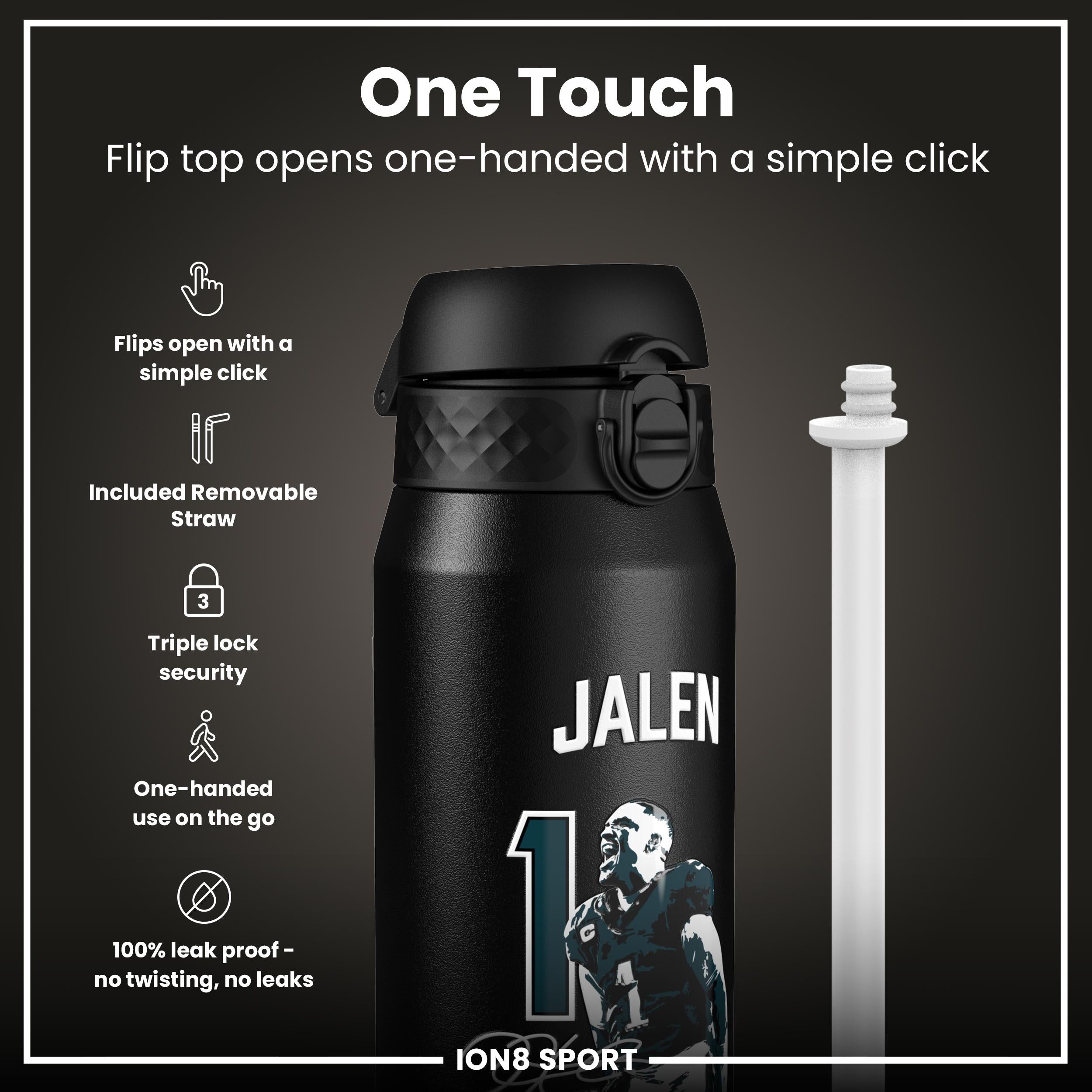 Start your journey towards hydration with a sleek, innovative water bottle that fits effortlessly into your busy routine. Whether you're hitting the gym, heading to the office, or embarking on an outdoor adventure, this stylish vessel is designed to keep your beverages at the desired temperature, thanks to its double-walled stainless steel construction. The convenient flip-top design makes staying refreshed a breeze, allowing for one-handed operation so you can keep moving with ease. From Ion8.This bottle has an added special feature as this bottle features Jalen Hurts, number and photo.