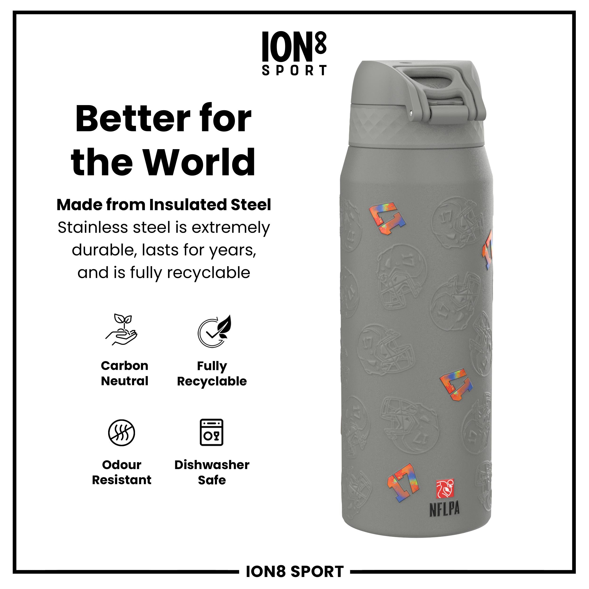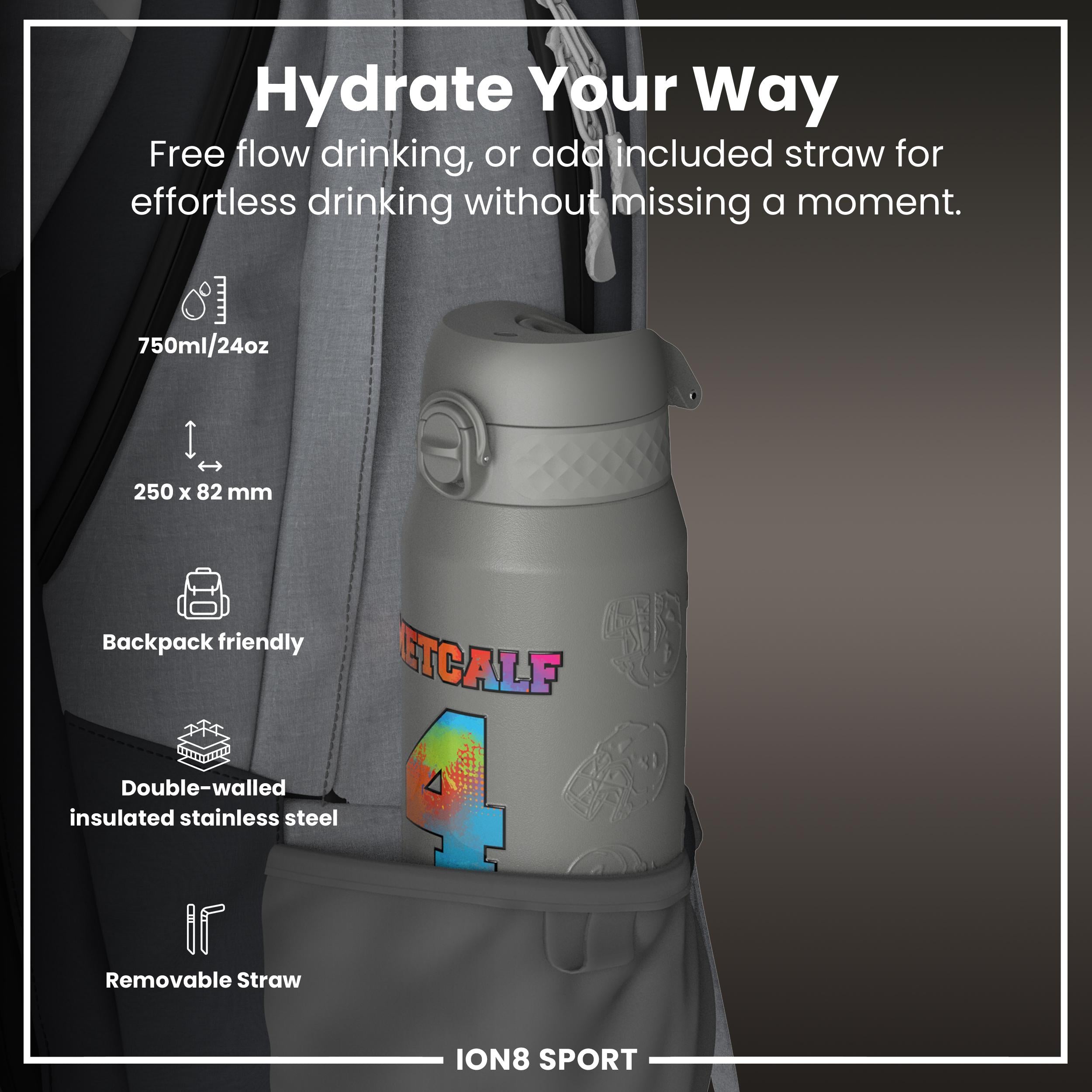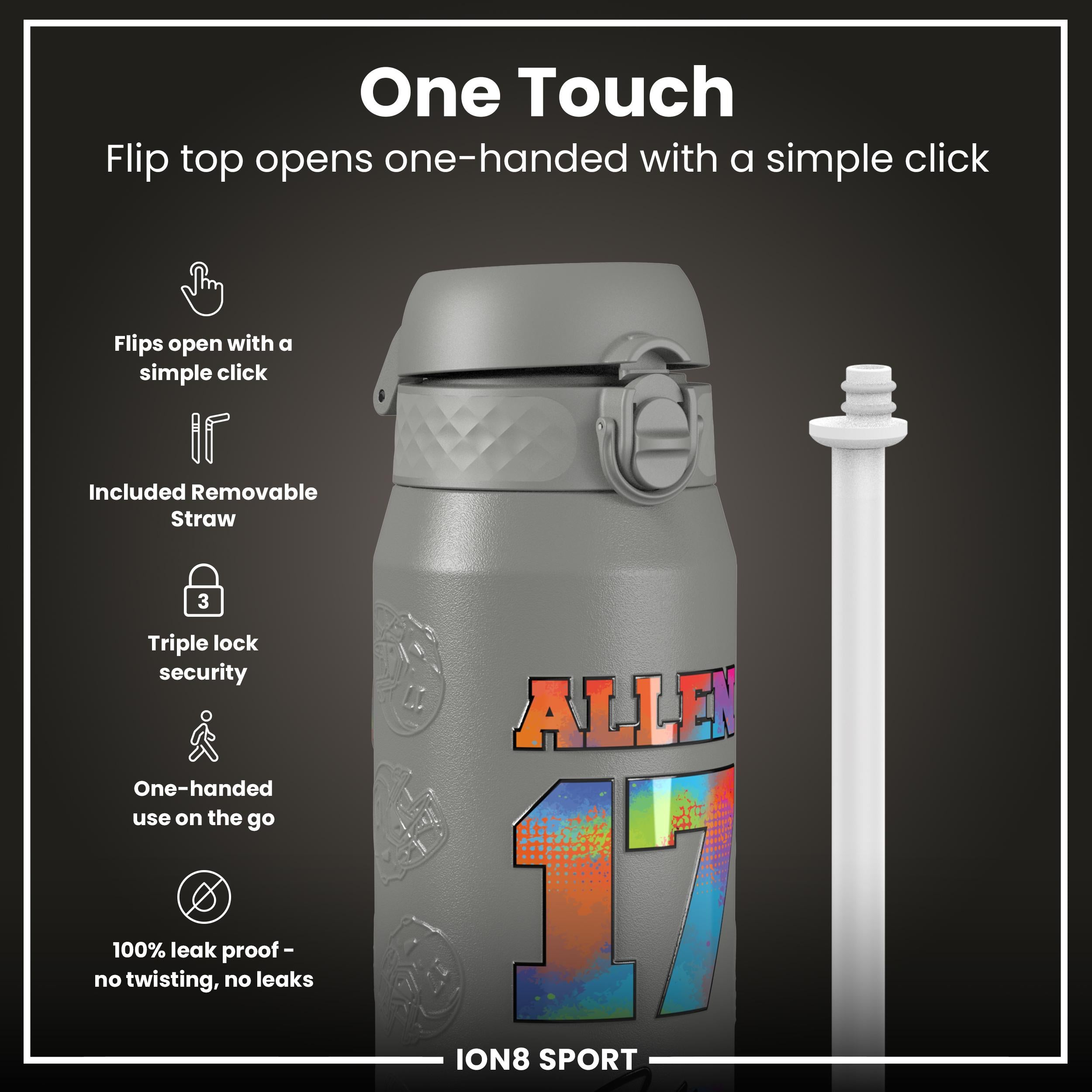 Start your journey towards hydration with a sleek, innovative water bottle that fits effortlessly into your busy routine. Whether you're hitting the gym, heading to the office, or embarking on an outdoor adventure, this stylish vessel is designed to keep your beverages at the desired temperature, thanks to its double-walled stainless steel construction. The convenient flip-top design makes staying refreshed a breeze, allowing for one-handed operation so you can keep moving with ease. From Ion8.This bottle has an added special feature as this bottle features Josh Allen, number and photo.