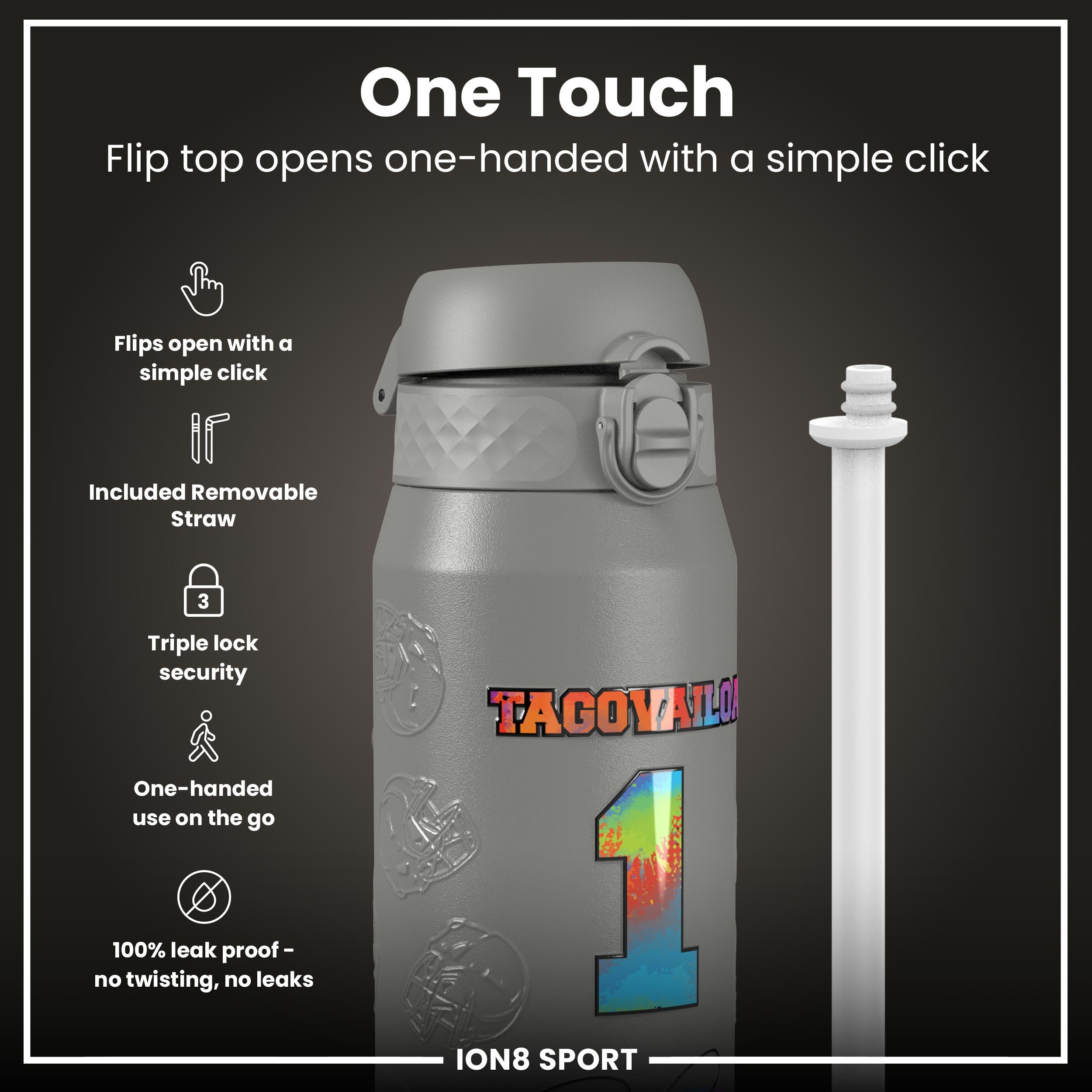 Start your journey towards hydration with a sleek, innovative water bottle that fits effortlessly into your busy routine. Whether you're hitting the gym, heading to the office, or embarking on an outdoor adventure, this stylish vessel is designed to keep your beverages at the desired temperature, thanks to its double-walled stainless steel construction. The convenient flip-top design makes staying refreshed a breeze, allowing for one-handed operation so you can keep moving with ease. From Ion8.This bottle has an added special feature as this bottle features Tua Tagovailoa, number and photo.