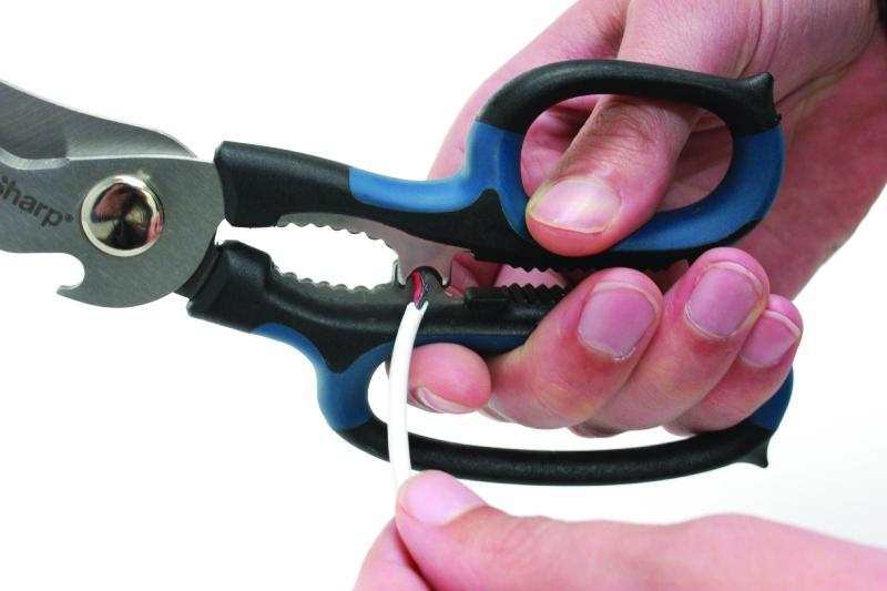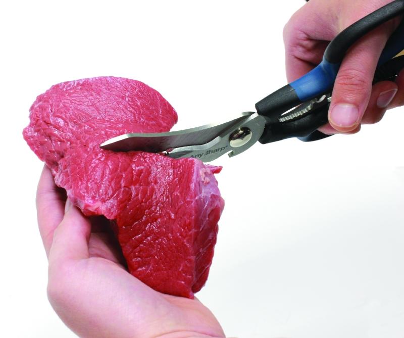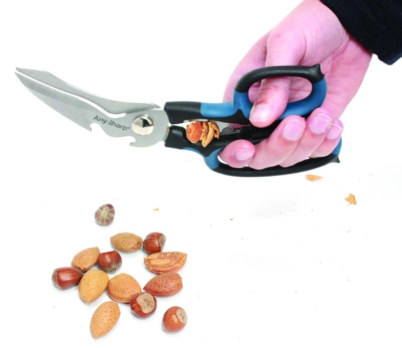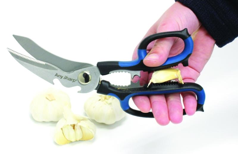 The AnySharp 5-in-1 Multifunction Scissors may be the only scissors you will ever need! Five handy tools all rolled into one: 1) “Cut-anything” scissors; 2) Bottle opener; 3) Garlic crusher; 4) Nut cracker; and 5) Wire stripper. These razor-sharp, hardened steel blades easily cut tough materials, such as blister packs, wire, cloth, carpet, meat, and even chicken bone!