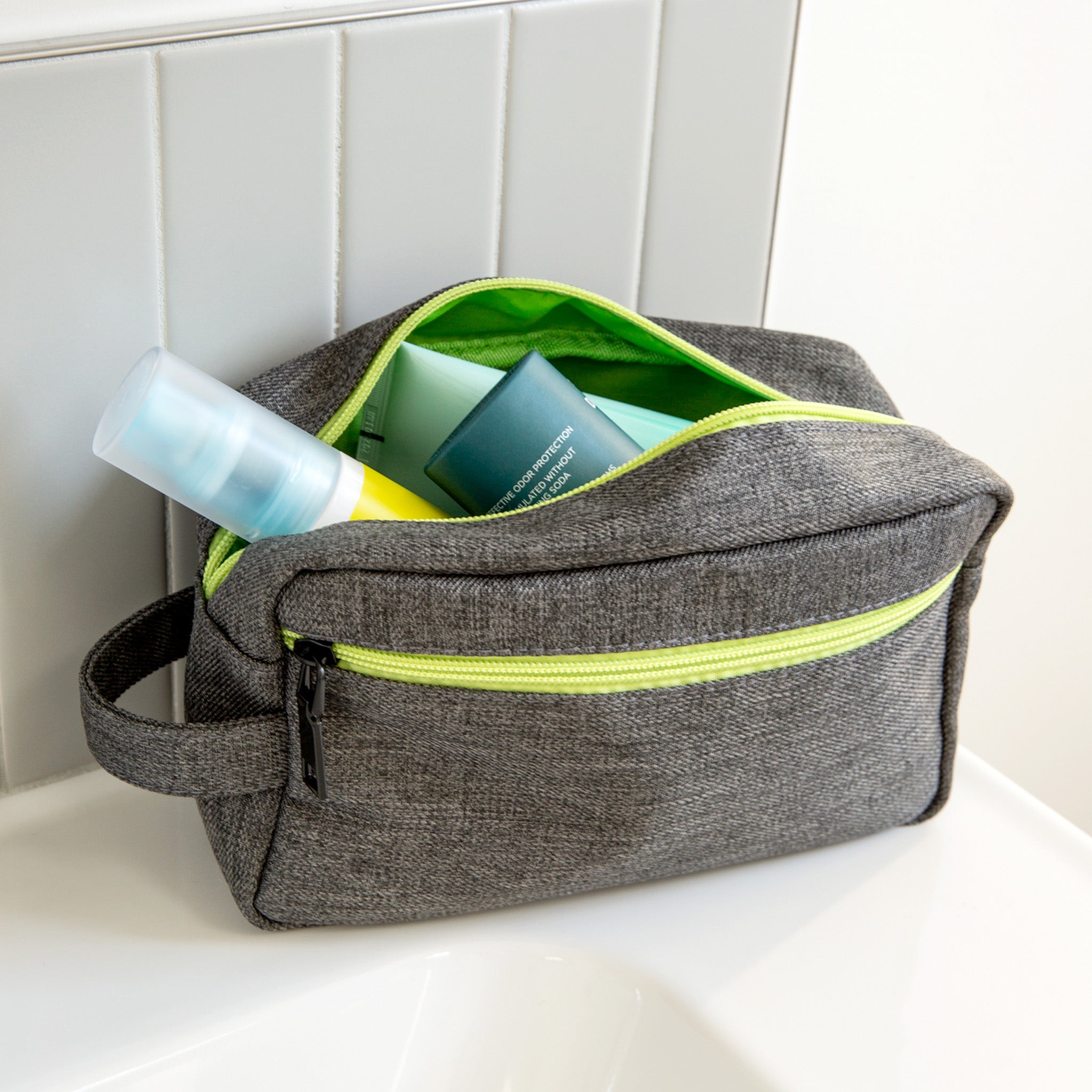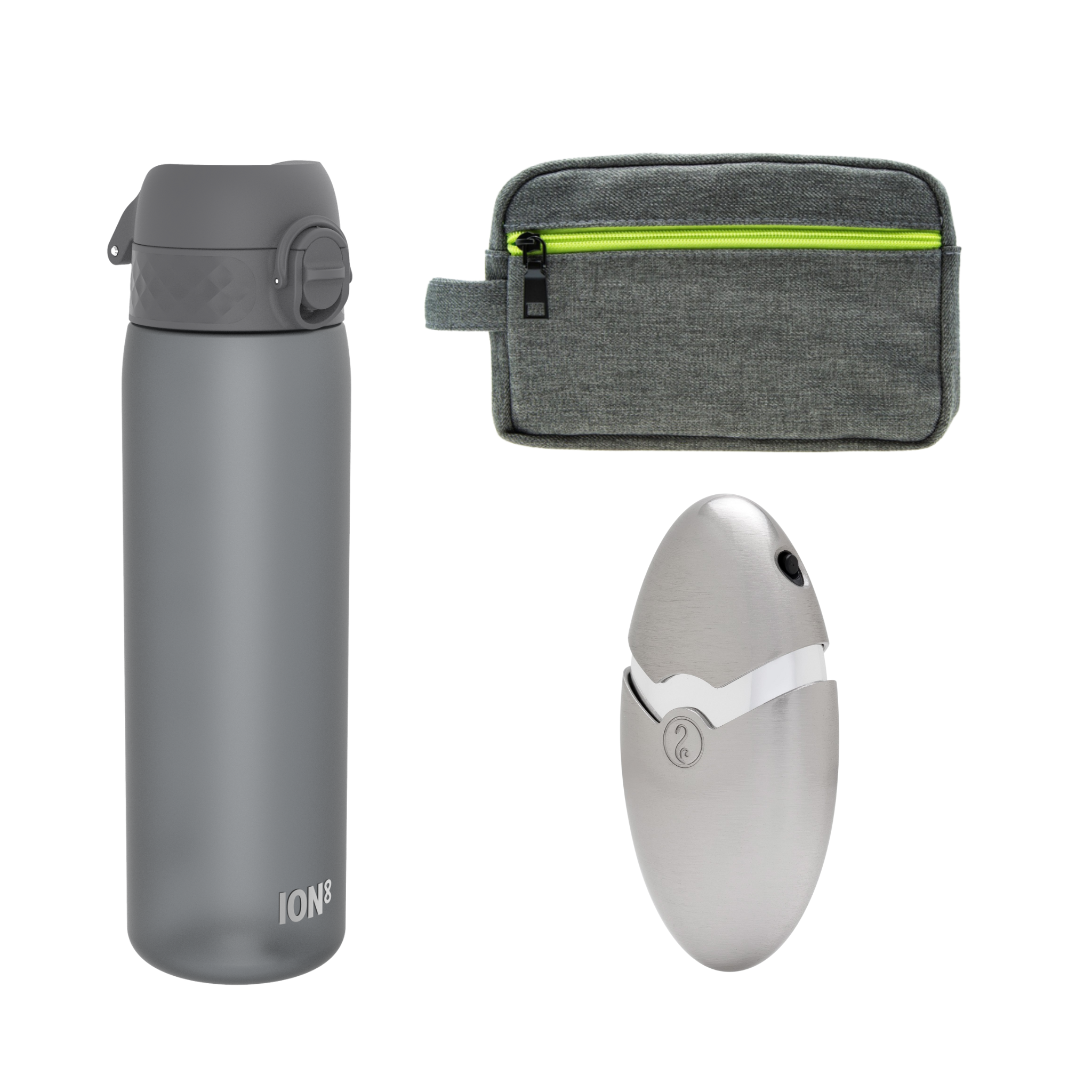 Everyday Essentials for Him – this sleek bundle is made for the guy who’s always on the move. It includes a durable gray canvas dopp kit with a bold neon yellow zipper—a stylish yet practical way to keep grooming gear in check. The silver Travalo cologne atomizer is TSA-friendly and refillable, perfect for carrying his signature scent without the bulk of a full bottle. And to keep him refreshed all day, we’ve included the ION8 Leakproof Water Bottle in matte gray. This 17oz bottle features a one-touch open design and is 100% BPA free—ideal for workouts, travel, or the daily commute.