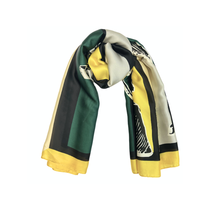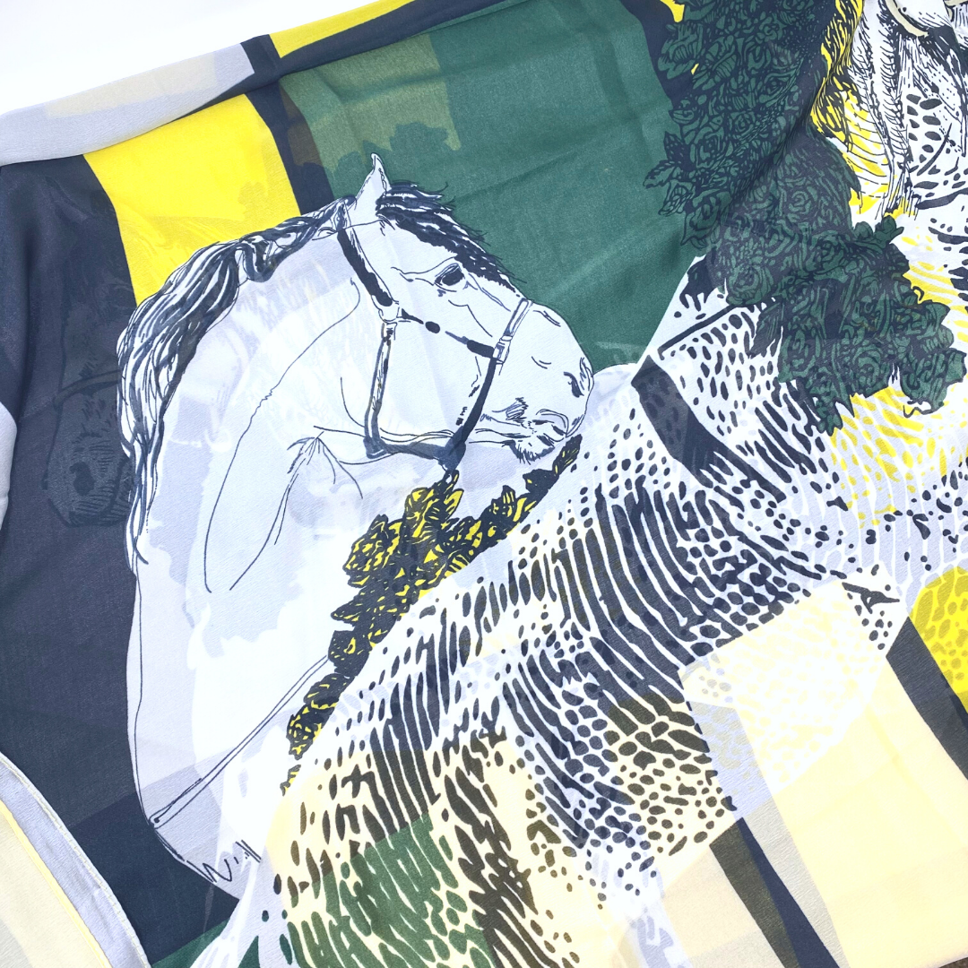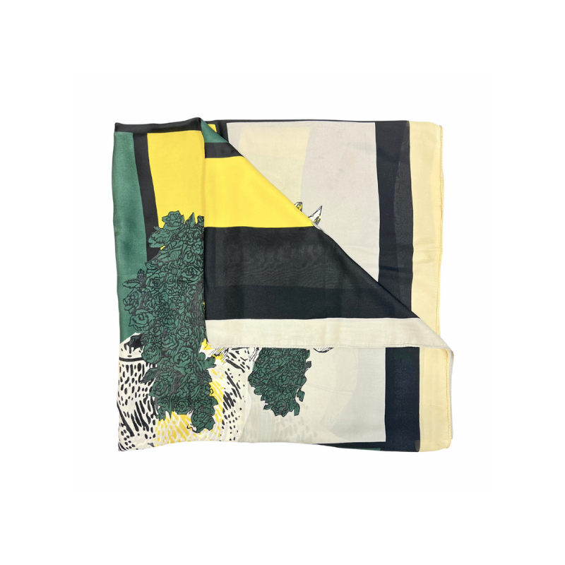 This scarf is rich in color design and color. Patterns of green, yellow, white, cream and black adorn this luxurious and soft accessory. Perfect for fashionable women of all ages.