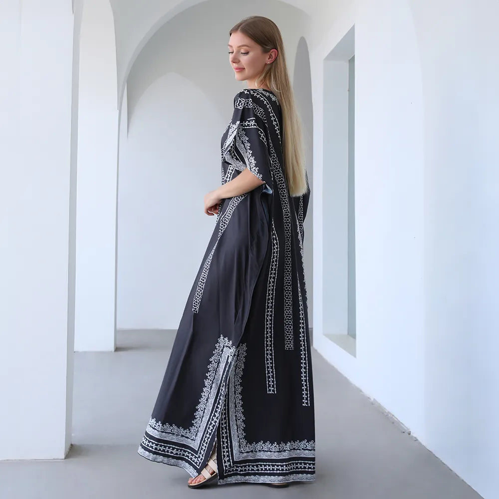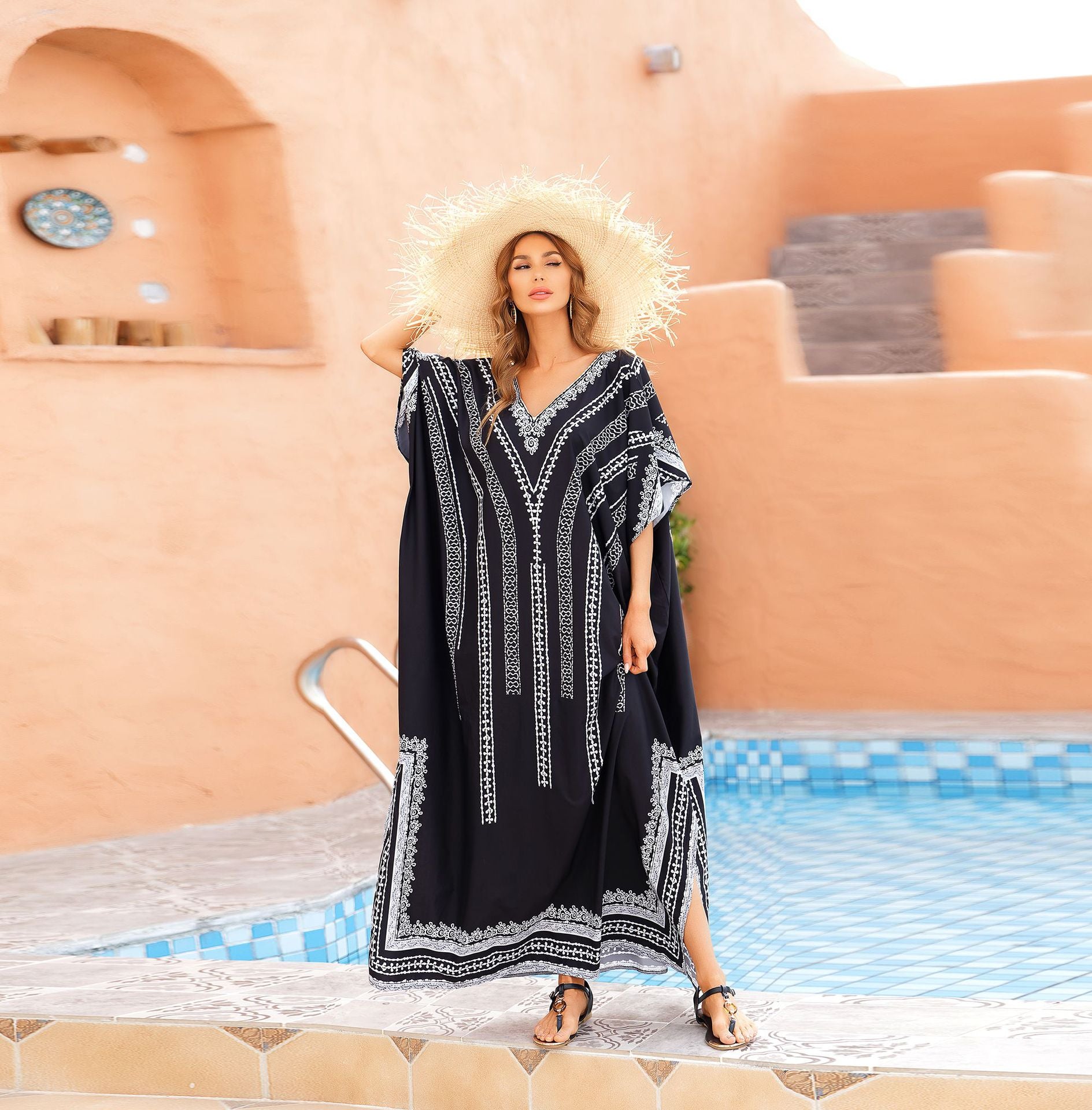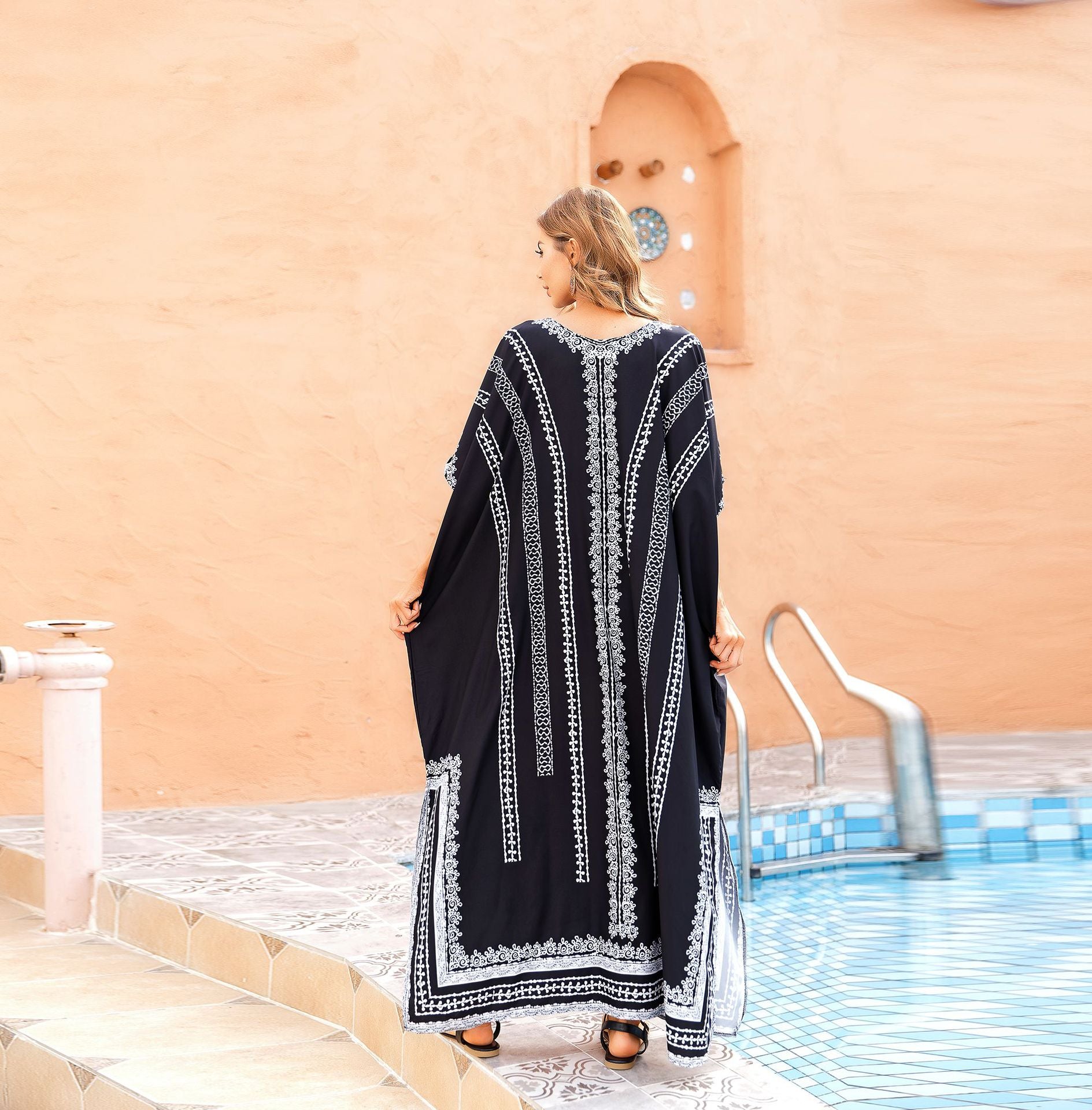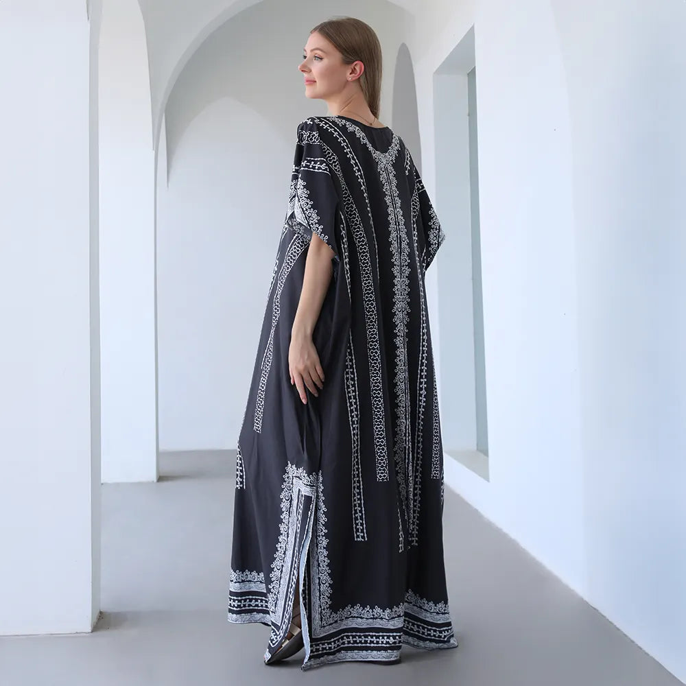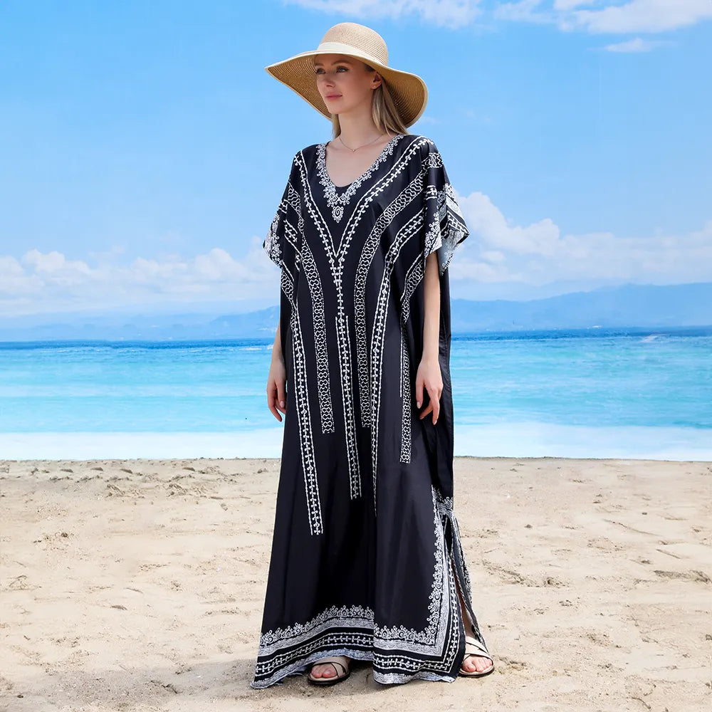 Featuring intricate geometric patterns, this flowing dress is perfect for any occasion, from casual poolside lounging to elegant evening gatherings. Made from soft, breathable fabric, it ensures you stay stylish and comfortable all day long.
