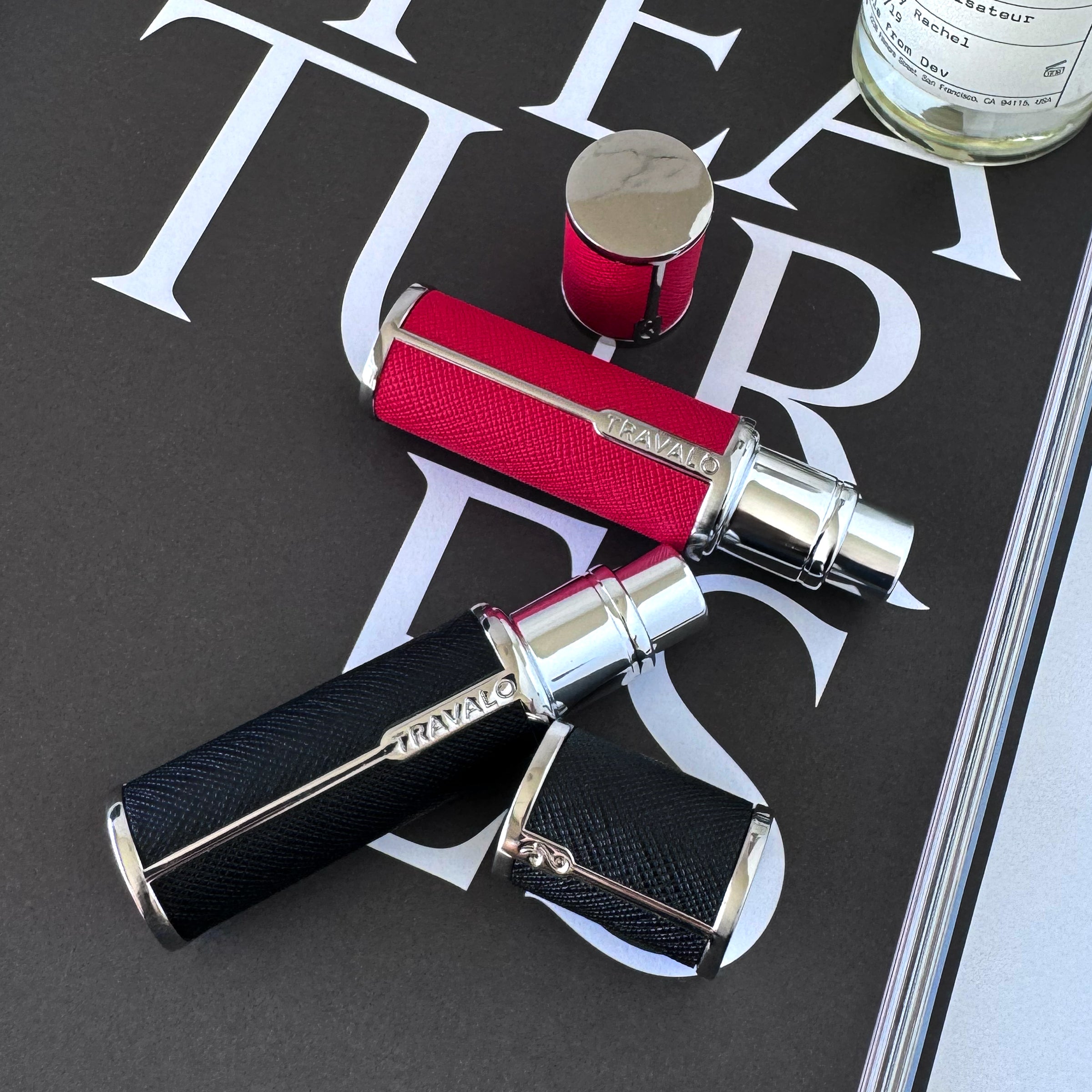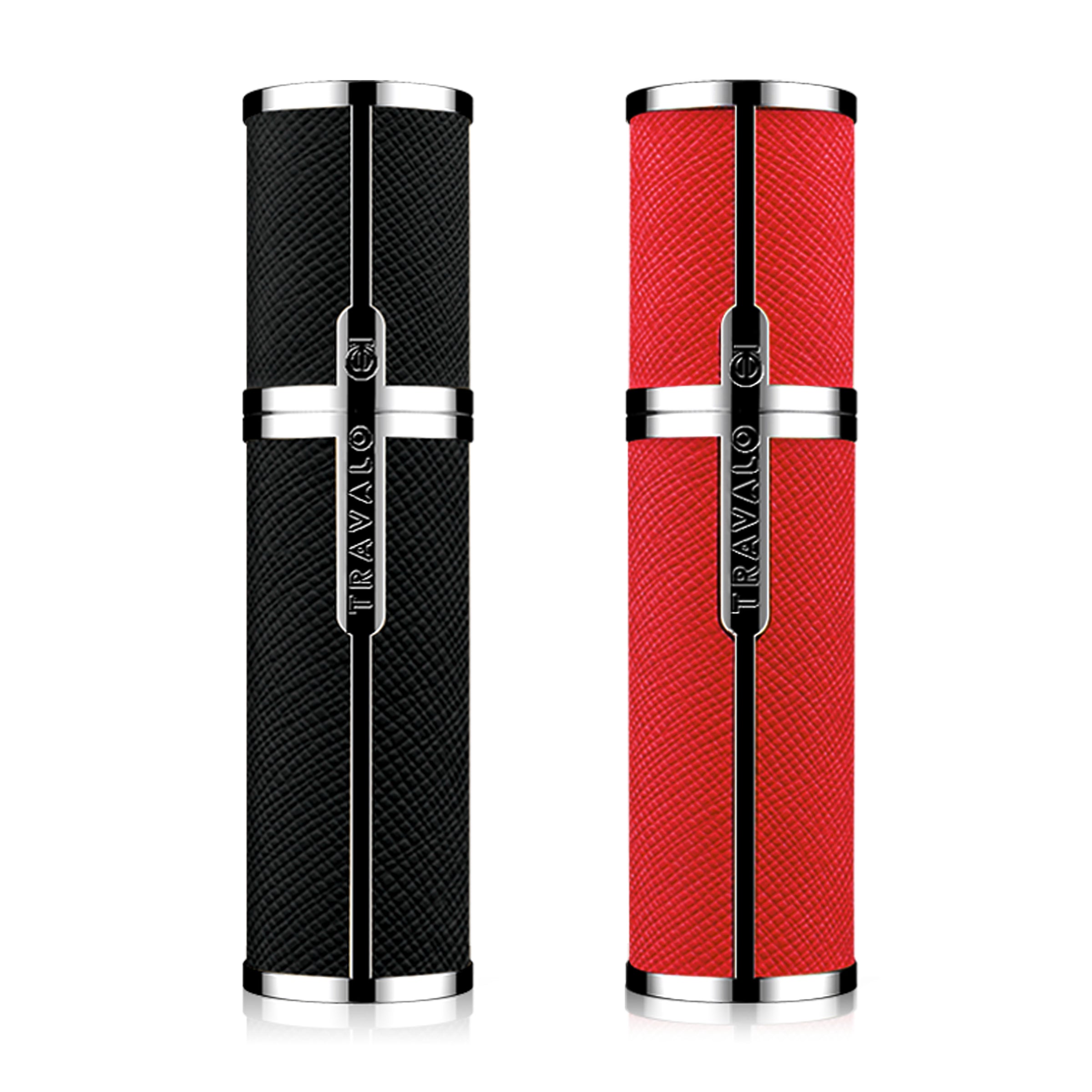 Travalo Milano Refillable Fragrance Atomizer Duo. Designed for fragrance lovers who appreciate both form and function, this luxurious set features two sleek atomizers in bold black and red designs. The red boasts elegant gold accents, while the black is accented with classic silver, offering the perfect blend of sophistication and practicality.