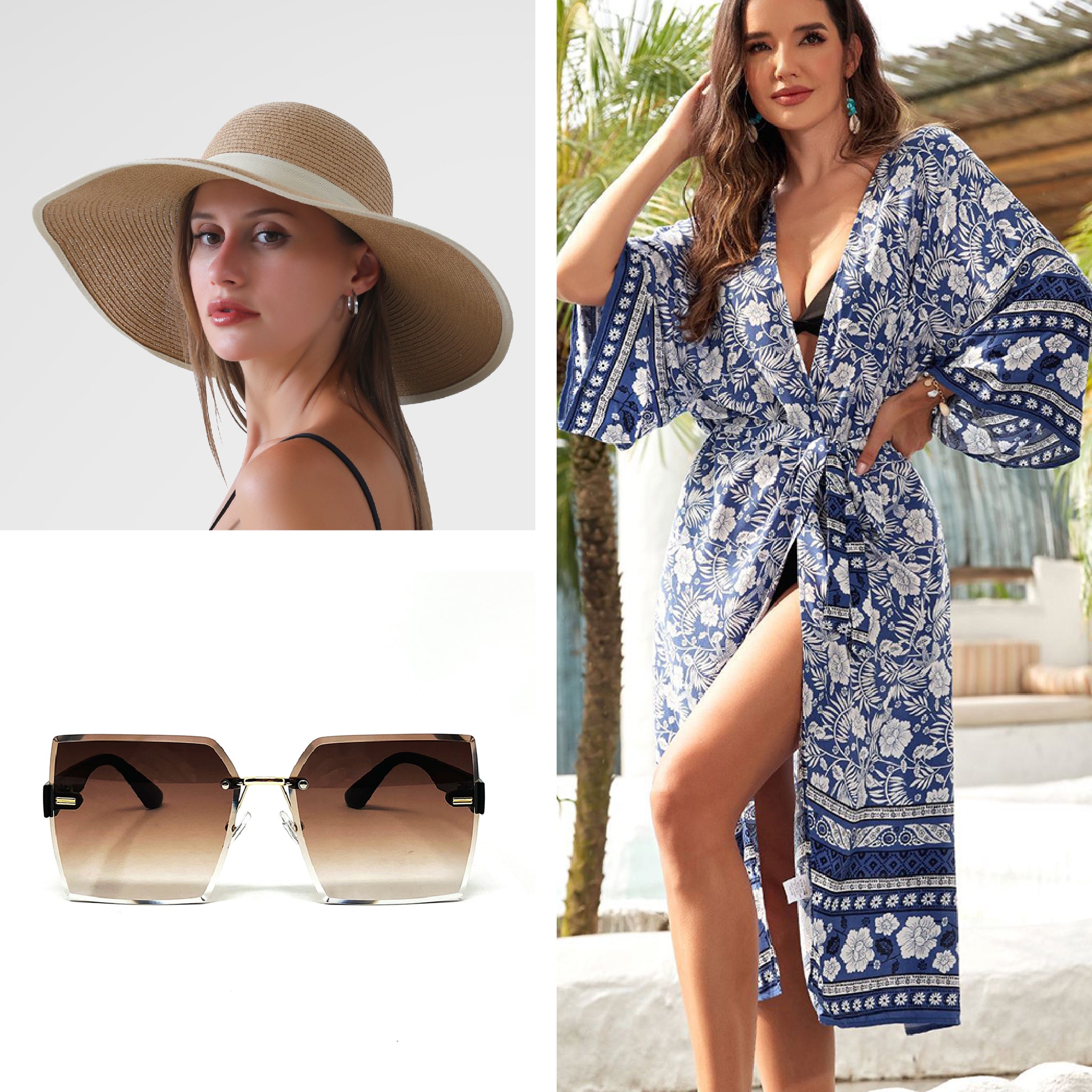 This isn't just any Summer bundle. Whether you're lounging by the ocean or exploring seaside towns, with a hat that folds neatly into your suitcase, a luxurious satiny beach coverup along with the Lido oversized sunglasses, you are set for summer.